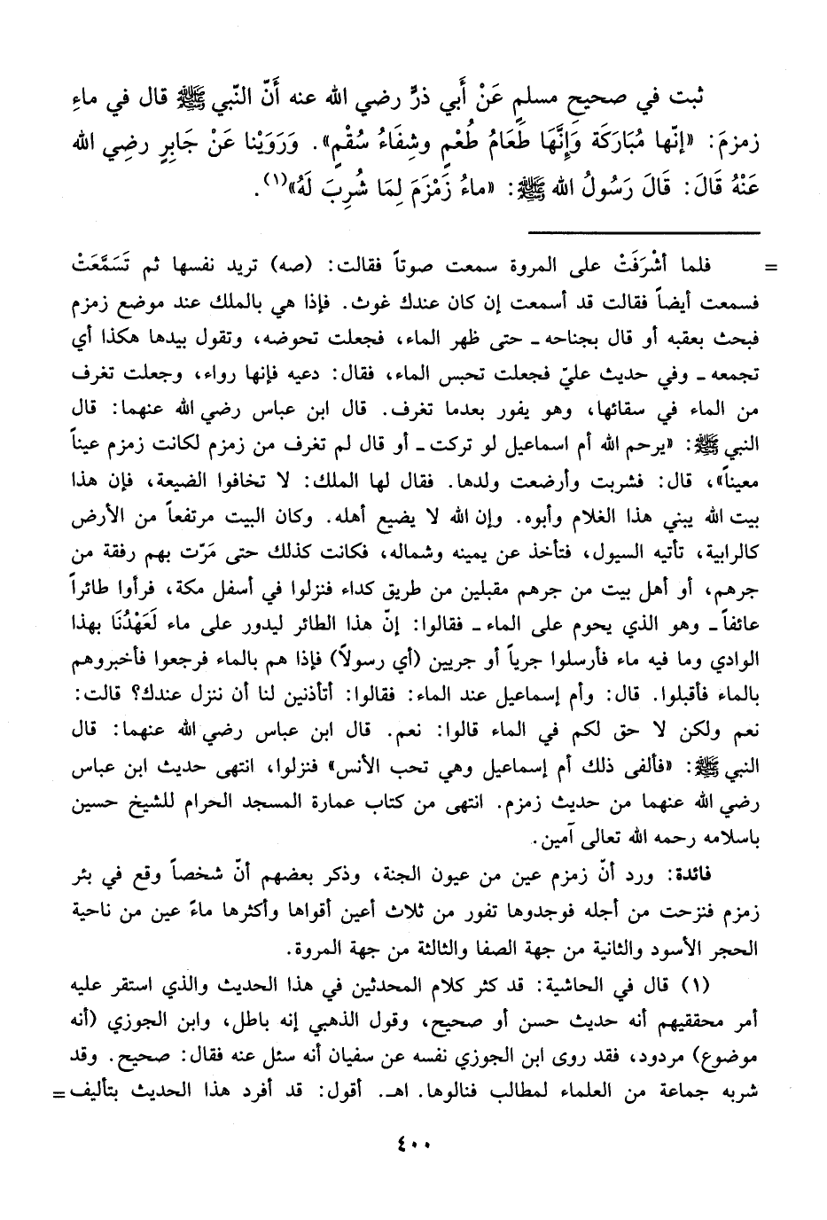 (¬1) قال في الحاشية: قد كثر كلام المحدثين في هذا الحديث والذي استقر عليه أمر محققيهم أنه حديث حسن أو صحيح، وقول الذهبي إنه باطل، وابن الجوزي (أنه موضوع) مردود، فقد روى ابن الجوزي نفسه عن سفيان أنه سئل عنه فقال: صحيح. وقد شربه جماعة من العلماء لمطالب فنالوها. اهـ. أقول: قد أفرد هذا الحديث بتأليف =