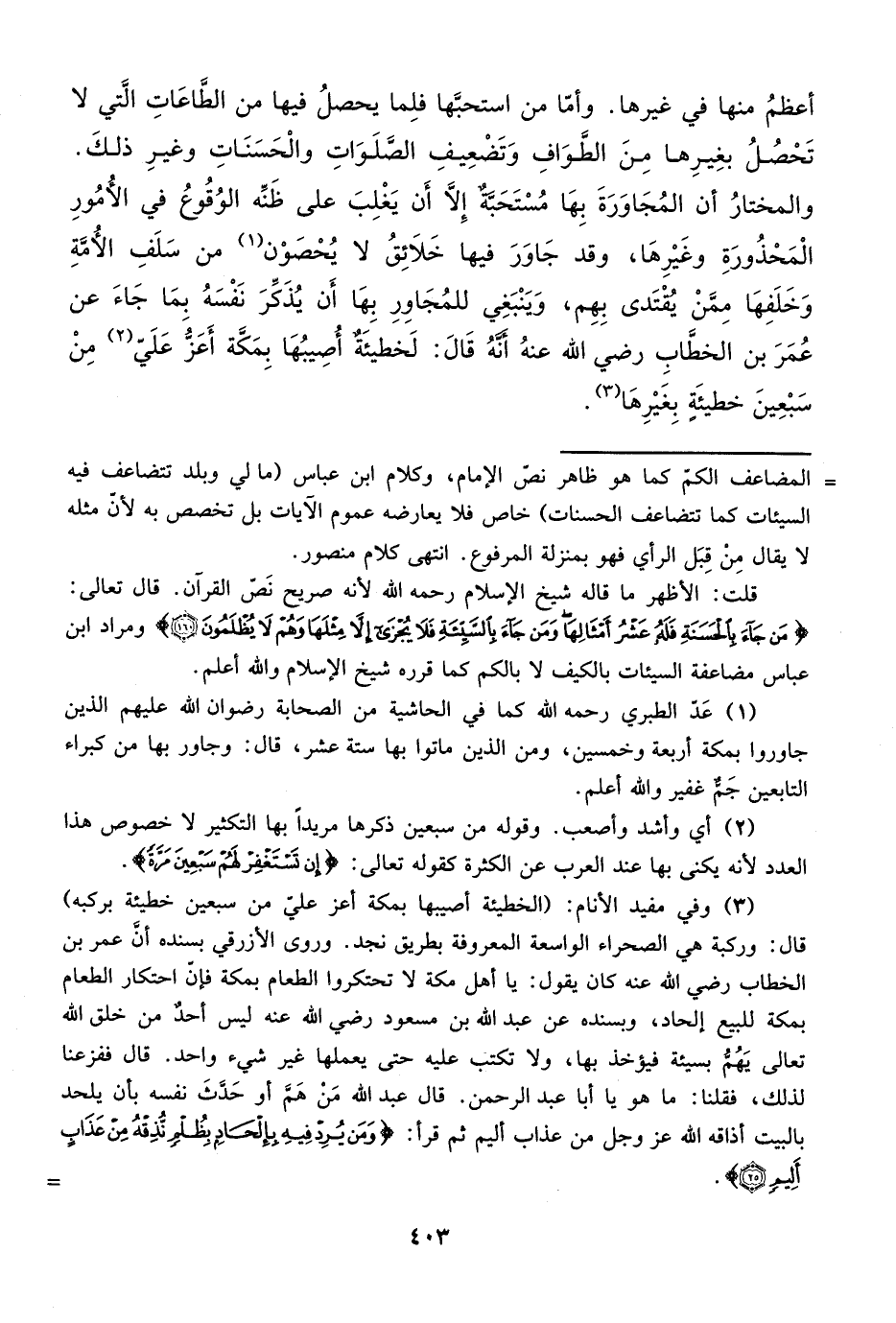 = المضاعف الكم كما هو ظاهر نص الإمام، وكلام ابن عباس (ما لي وبلد تتضاعف فيه السيئات كما تتضاعف الحسنات) خاص فلا يعارضه عموم الآيات بل تخصص به لأن مثله لا يقال مِنْ قِبَل الرأي فهو بمنزلة المرفوع. انتهى كلام منصور.