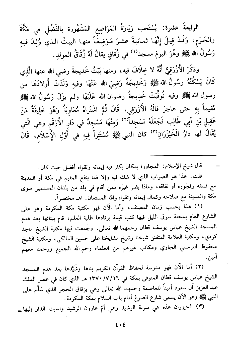الرابعةَ عشرة: يُسْتَحب زيَارَةُ المَوَاضِعِ المَشْهُورة بالفَضْلِ في مكة والحَرَمِ، وَقَدْ قِيلَ إنَّهَا ثمانيةَ عشرَ مَوْضِعَاً منها البيتُ الذي وُلِدَ فيه رَسُولُ الله - صلى الله عليه وسلم - وهُوَ اليومَ مسجد (¬1) في زُقَاق يقالُ لَهُ زُقَاقُ المولدِ.