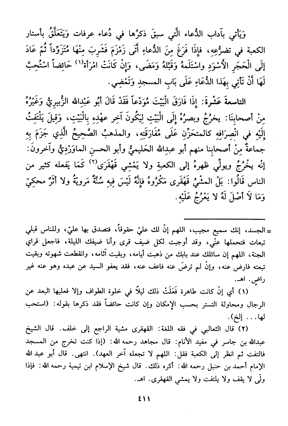 التاسعةَ عَشْرةَ: إذَا فَارَقَ الْبَيْتَ مُوَدّعاً فَقَدْ قَالَ أبُو عَبْدِ الله الزُّبيرِيُّ وَغَيْرُهُ مِنْ أصحابِنَا: يخرُجُ وبصرُهُ إلَى الْبَيْتِ لِيَكُونَ آخِر عهْدِهِ بِالْبَيْتِ، وَقِيلَ يَلْتَفِتُ إِلَيْهِ في انصِرَافِه كالمتحَزِّنِ عَلَى مُفَارَقَتِهِ، والمذهبُ الصَّحِيحُ الَّذِي جَزَمَ بِهِ جماعةٌ مِنْ أصحابِنا منهم أبو عبدِ الله الحَليمي وأبو الحسنِ الماوَرْدِيُّ وآخرونَ: إنْه يخْرُجُ ويولي ظهرهُ إلى الكعبةِ ولا يَمْشِي قَهْقَرَى (¬2) كَمَا يفعله كثير من الناس قَالُوا: بَلْ المشْيُ قَهْقَرى مَكْرُوهُ فإنَّهُ لَيْسَ فِيهِ سُنَّةٌ مَرويّةُ ولا أثَرٌ محكِيّ وَمَا لاَ أصْلَ لَهُ لا يَعْرُجُ عَلَيْهِ.