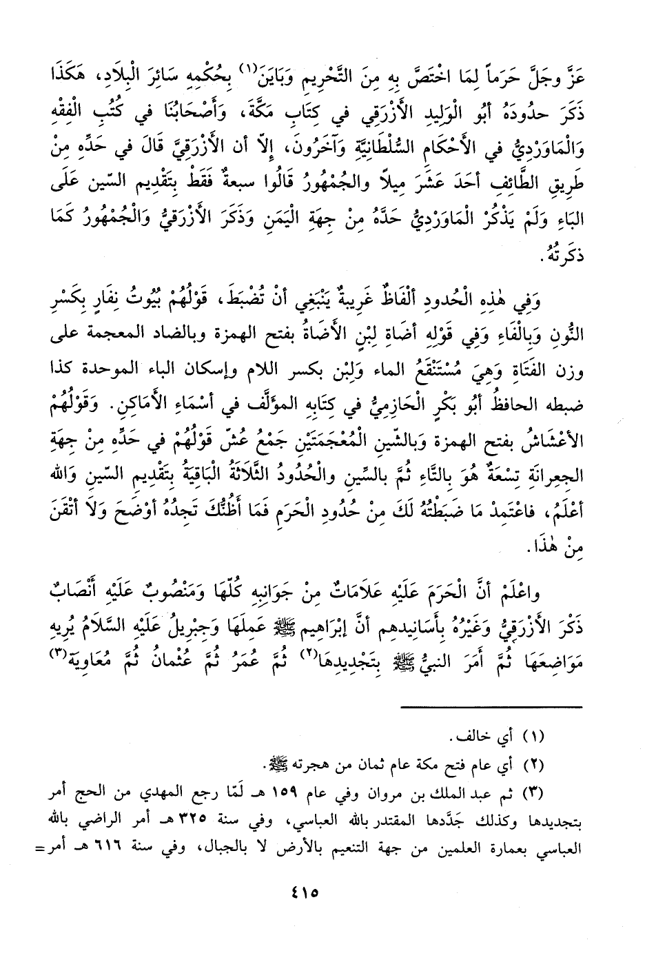 واعْلَمْ أنَّ الْحَرَمَ عَلَيْهِ عَلاَمَاتٌ مِنْ جَوَانبِهِ كُلّهَا وَمَنْصُوب عَلَيْهِ أَنْصَاب ذَكْرَ الأَزْرَقي وَغَيْرُهُ بِأَسَانِيدهِم أنَّ إبْرَاهِيم - صلى الله عليه وسلم - عَمِلَهَا وَجِبْرِيلُ عَلَيْهِ السَّلاَمُ يُرِيهِ مَوَاضِعَهَا ثُمَّ أَمَرَ النبيُّ - صلى الله عليه وسلم - بِتَجْدِيدِهَا (¬2) ثُمَّ عُمَرُ ثُمَّ عُثْمانُ ثُم مُعَاوِية (¬3)