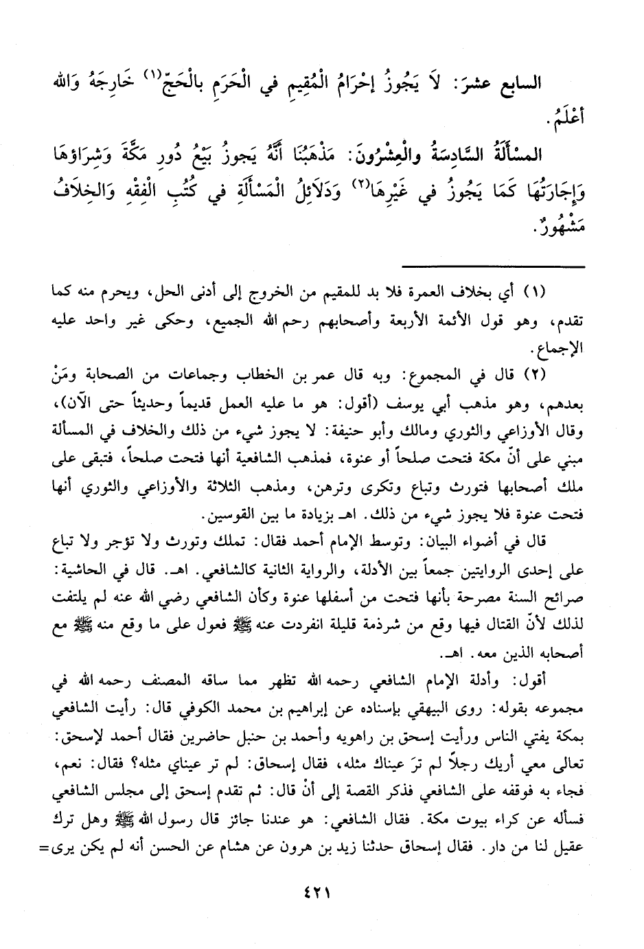 (¬2) قال في المجموع: وبه قال عمر بن الخطاب وجماعات من الصحابة ومَنْ بعدهم، وهو مذهب أبي يوسف (أقول: هو ما عليه العمل قديماً وحديثاً حتى الآن)، وقال الأوزاعي والثوري ومالك وأبو حنيفة: لا يجوز شيء من ذلك والخلاف في المسألة مبني على أن مكة فتحت صلحاً أو عنوة، فمذهب الشافعية أنها فتحت صلحاً، فتبقى على ملك أصحابها فتورث وتباع وتكرى وترهن، ومذهب الثلاثة والأوزاعي والثوري أنها فتحت عنوة فلا يجوز شيء من ذلك. اهـ بزيادة ما بين القوسين.