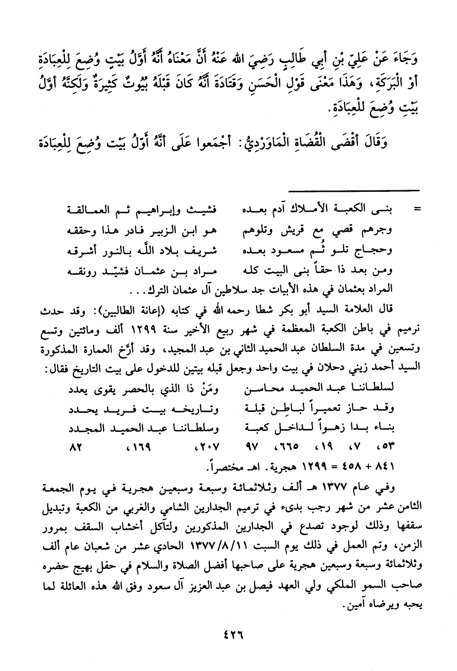 قال العلامة السيد أبو بكر شطا رحمه الله في كتابه (إعانة الطالبين): وقد حدث ترميم في باطن الكعبة المعظمة في شهر ربيع الأخير سنة 1299 ألف ومائتين وتسع وتسعين في مدة السلطان عبد الحميد الثاني بن عبد المجيد، وقد أرَّخ العمارة المذكورة السيد أحمد زيني دحلان في بيت واحد وجعل قبله بيتين للدخول على بيت التاريخ فقال:
