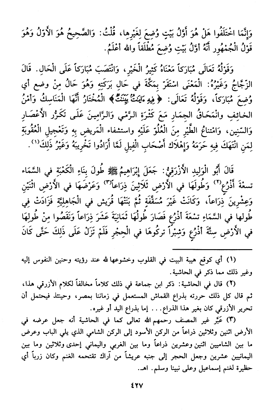 (¬2) قال في الحاشية: ذكر ابن جماعة في ذلك كلاماً مخالفاً لكلام الأزرقي هذا، ثم قال كل ذلك حررته بذراع القماش المستعمل في زماننا بمصر، وحينئذ فيحتمل أن تحرير الأزرقي كان بغير هذا الذراع ... إما بذراع اليد أو غيره.