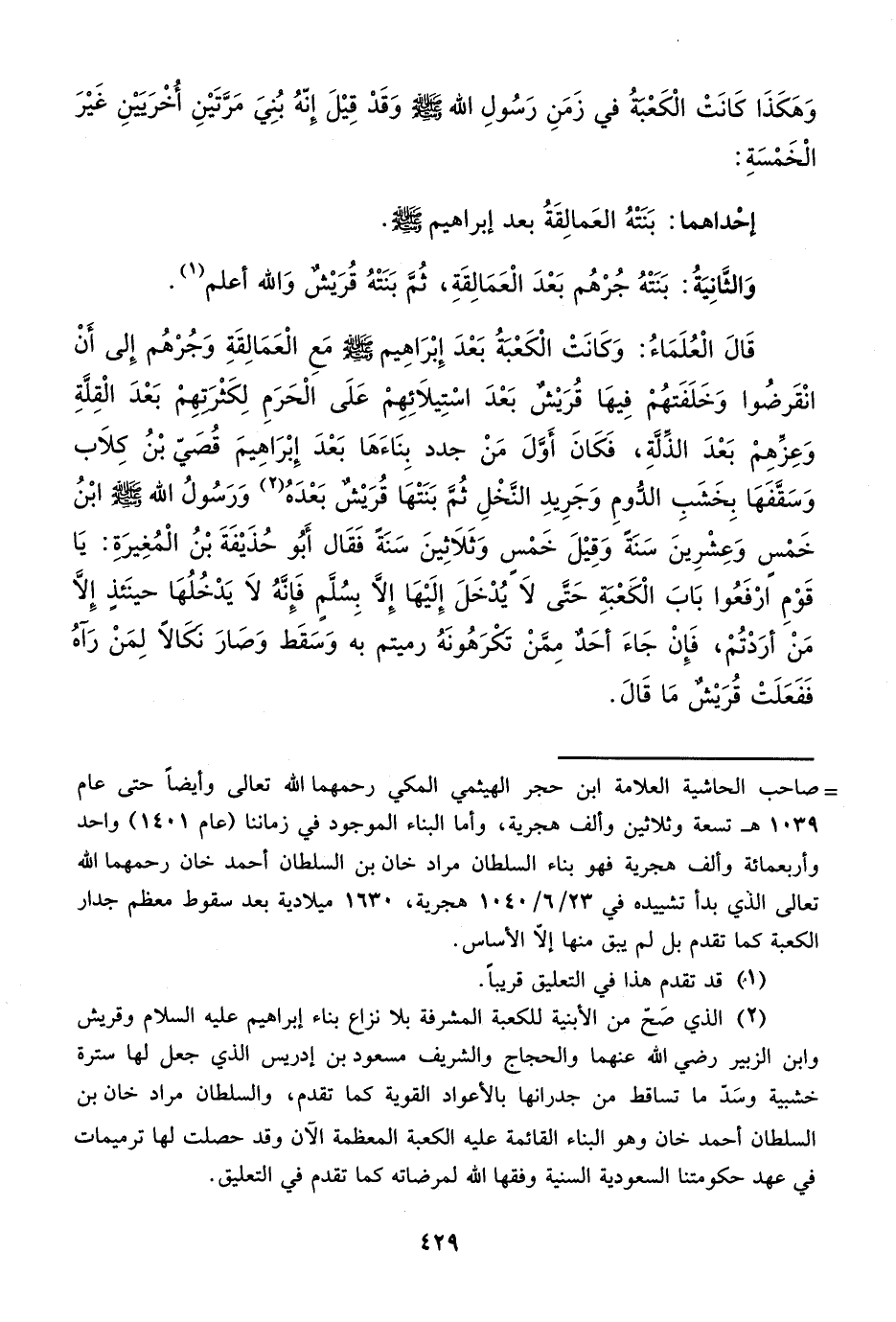 = صاحب الحاشية العلامة ابن حجر الهيثمي المكي رحمهما الله تعالى وأيضاً حتى عام 1039 هـ تسعة وثلاثين وألف هجرية، وأما البناء الموجود في زماننا (عام 1401) واحد وأربعمائة وألف هجرية فهو بناء السلطان مراد خان بن السلطان أحمد خان رحمهما الله تعالى الذي بدأ تشييده في 23/ 6/ 1040 هجرية، 1630 ميلادية بعد سقوط معظم جدار الكعبة كما تقدم بل لم يبق منها إلا الأساس.