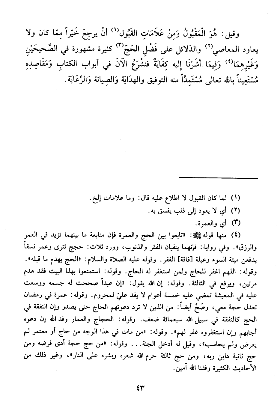 وقيل: هُوَ الْمَقْبُولُ وَمِنْ عَلاَمَاتِ القَبُول (¬1) أنْ يرجِعَ خَيْراً مِمّا كان ولا يعاود المعاصي (¬2) والدَلائل على فَضْلِ الحَجّ (¬3) كثيرة مشهورة في الصَّحيحَيْنِ وَغَيْرِهِمَا (¬4) وَفِيمَا أشَرْنَا إِليه كِفَايةٌ فنشْرَعُ الآنَ في أبواب الكتابِ وَمَقَاصِده مُسْتَعِيناً بالله تعالى مُسْتَمِداً منه التوفيق والهدَاية وَالصِيانة وَالرِّعَاية.