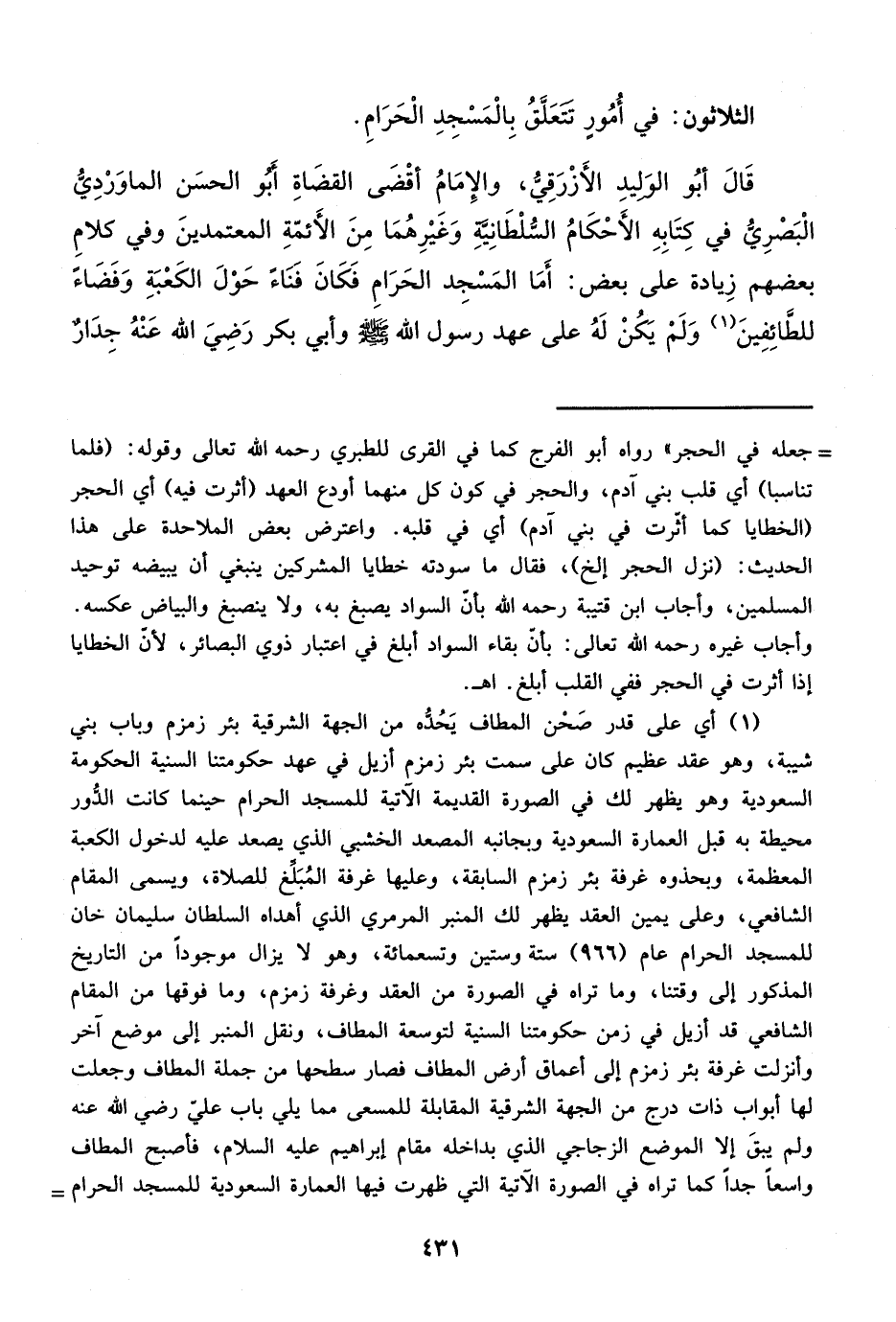 (¬1) أي على قدر صَحْن المطاف يَحُدُّه من الجهة الشرقية بئر زمزم وباب بني شيبة، وهو عقد عظيم كان على سمت بئر زمزم أزيل في عهد حكومتنا السنية الحكومة السعودية وهو يظهر لك في الصورة القديمة الآتية للمسجد الحرام حينما كانت الدور محيطة به قبل العمارة السعودية وبجانبه المصعد الخشبي الذي يصعد عليه لدخول الكعبة المعظمة، وبحذوه غرفة بئر زمزم السابقة، وعليها غرفة المُبَلغ للصلاة، ويسمى المقام الشافعي، وعلى يمين العقد يظهر لك المنبر المرمري الذي أهداه السلطان سليمان خان للمسجد الحرام عام (966) ستة وستين وتسعمائة، وهو لا يزال موجوداً من التاريخ المذكور إلى وقتنا، وما تراه في الصورة من العقد وغرفة زمزم، وما فوقها من المقام الشافعي قد أزيل في زمن حكومتنا السنية لتوسعة المطاف، ونقل المنبر إلى موضع آخر وأنزلت غرفة بئر زمزم إلى أعماق أرض المطاف فصار سطحها من جملة المطاف وجعلت لها أبواب ذات درج من الجهة الشرقية المقابلة للمسعى مما يلي باب علي رضي الله عنه ولم يبقَ إلا الموضع الزجاجي الذي بداخله مقام إبراهيم عليه السلام، فأصبح المطاف واسعاً جداً كما تراه في الصورة الآتية التي ظهرت فيها العمارة السعودية للمسجد الحرام =