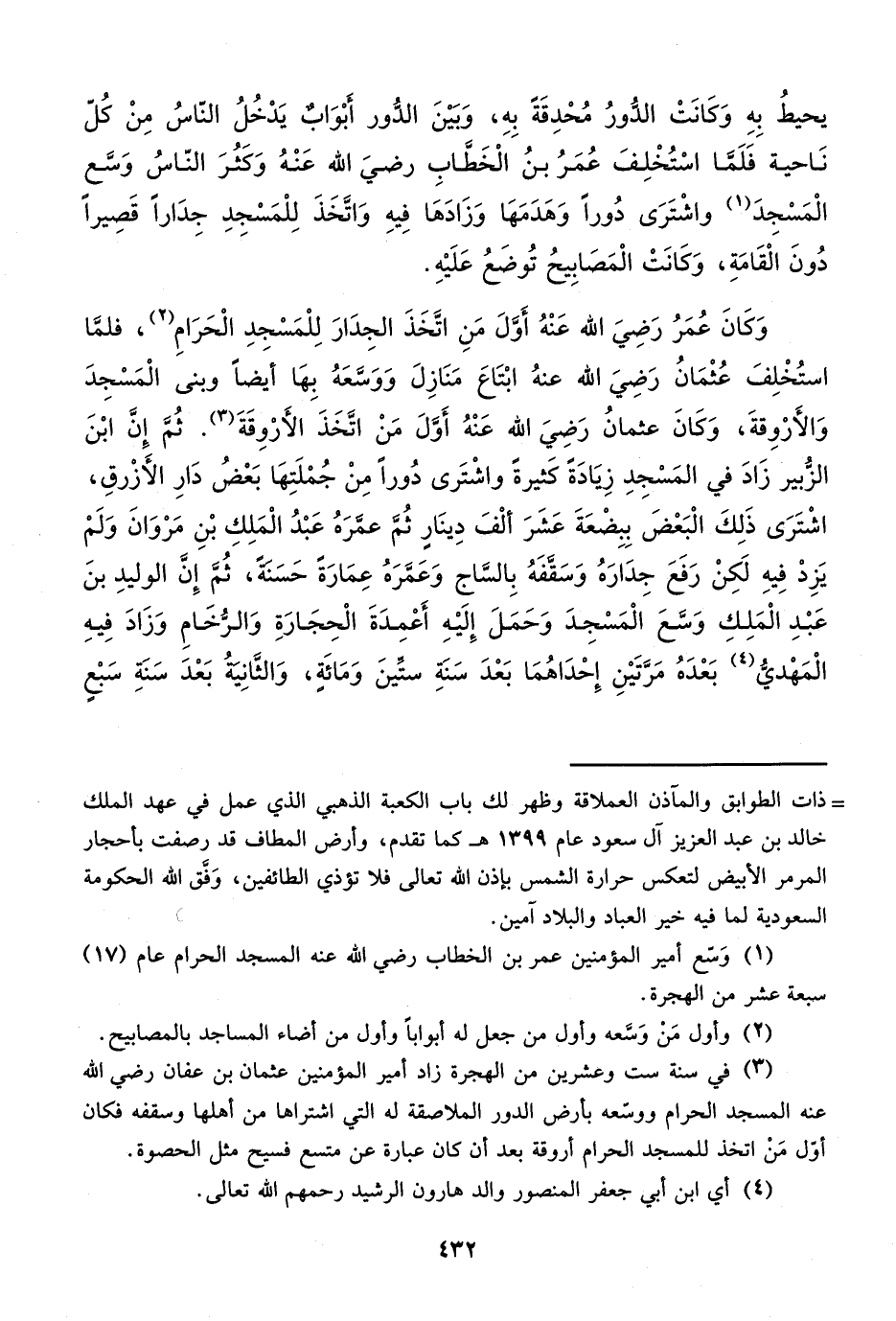 (¬3) في سنة ست وعشرين من الهجرة زاد أمير المؤمنين عثمان بن عفان رضي الله عنه المسجد الحرام ووسّعه بأرض الدور الملاصقة له التي اشتراها من أهلها وسقفه فكان أوّل مَنْ اتخذ للمسجد الحرام أروقة بعد أن كان عبارة عن متسع فسيح مثل الحصوة.