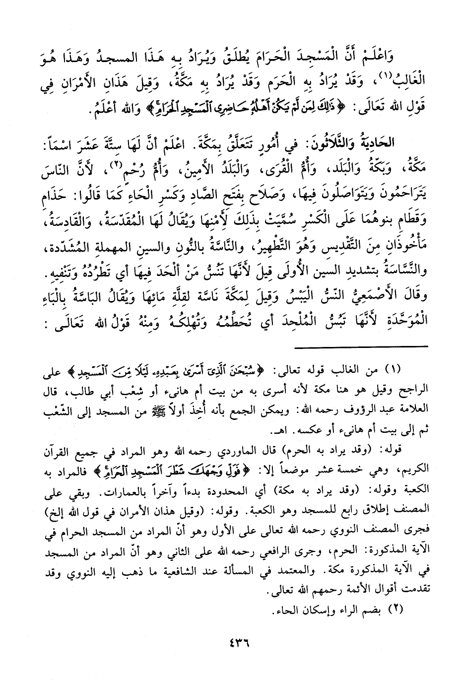 قوله: (وقد يراد به الحرم) قال الماوردي رحمه الله وهو المراد في جميع القرآن الكريم، وهي خمسة عشر موضعاً إلا: {فَوَلِّ وَجْهَكَ شَطْرَ الْمَسْجِدِ الْحَرَامِ} فالمراد به الكعبة وقوله: (وقد يراد به مكة) أي المحدودة بدءاً وآخراً بالعمارات. وبقي على المصنف إطلاق رابع للمسجد وهو الكعبة. وقوله: (وقيل هذان الأمران في قول الله إلخ) فجرى المصنف النووي رحمه الله تعالى على الأول وهو أنّ المراد من المسجد الحرام في الآية المذكورة: الحرم، وجرى الرافعي رحمه الله على الثاني وهو أن المراد من المسجد في الآية المذكورة مكة. والمعتمد في المسألة عند الشافعية ما ذهب إليه النووي وقد تقدمت أقوال الأئمة رحمهم الله تعالى.
