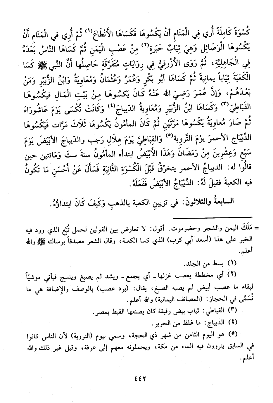 كُسْوَةً كَامِلَةً أري فِي الْمَنَامِ أنْ يكْسُوهَا فَكَسَاهَا الأَنْطَاعَ (¬1) ثُمّ أُرِي في الْمَنَامِ أَنْ يَكْسُوهَا الْوَصَائِل وَهِيَ ثِيَاب حَبَرةٍ (¬2) مِنْ عَصْبِ الْيَمَنِ ثُم كَسَاهَا النَّاسُ بَعْدَهُ فِي الْجَاهِلِيَّةِ، ثُم رَوَى الأَزْرقِي فِي رِوَايَاتٍ مُتَفَرَّقَةٍ حَاصِلُها أَن النَّبي - صلى الله عليه وسلم - كَسَا الْكَعْبَةَ ثِيَاباً يمانِيةً ثُم كَسَاهَا أبُو بكْرٍ وَعُمَرُ وَعُثْمَانُ وَمُعَاوِيةُ وَابْنُ الزبيرِ وَمَنْ بَعْدَهُمْ، وإن عُمَرَ رَضِيَ الله عَنْهُ كَانَ يَكسُوهَا مِنْ بَيْتِ الْمَالِ فيكْسُوهَا القَبَاطِيّ (¬3) وَكَسَاهَا ابْنُ الزبَيْرِ وَمُعَاوِيةُ الديباجَ (¬4) وَكَانَتْ تكْسَى يَوْمَ عَاشُورَاءَ ثُمَّ صَارَ مُعاوِيةُ يكْسُوهَا مَرتَيْنِ ثُم كَانَ المأمُونُ يكْسُوهَا ثَلاَثَ مَرات فَيَكْسُوهَا الديْبَاج الأحمرَ يوْمَ التروِية (¬5) وَالقِبَاطِي يَوْمَ هِلاَلِ رَجب والديباجَ الأبْيَضَ يَوْمَ سَبع وَعشرِينَ مِنْ رَمَضَاَن وَهَذَا الأَبْيَضُ ابتدأه المأمُونُ سنةَ ستّ وَمَائتين حين قالُوا له: الديباجُ الأحمر يتخرّقُ قَبْلَ الْكُسْوَةِ الثانِيةِ فَسَأَلَ عَنْ أَحْسَنِ مَا تكونُ فيه الكعبةَ فقيلَ لَهُ: الديْبَاجُ الأبْيَضُ فَفَعَلَهُ.