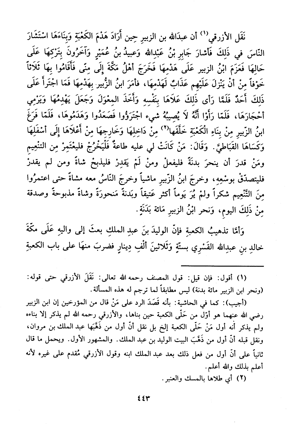 نَقَل الأزرقي (¬1) أن عبدَ الله بن الزبيرِ حِين أَرَادَ هَدْمَ الكَعْبةَ وَبِنَاءَهَا اسْتَشَارَ النّاسَ في ذَلِكَ فَأشارَ جَابِرِ بْنُ عَبْدِ الله وَعبيدُ بنُ عُمَيْر وَآخَرُونَ بِتَرْكِهَا عَلَى حَالِهَا فَعَزَمَ ابْنُ الزبير عَلَى هَدْمِهَا فَخَرَجَ أهْلُ مَكَّةَ إِلَى مِنى فَأَقَامُوا بِهَا ثَلاَثاً خَوْفاً مِنْ أنْ يَنْزلَ عَلَيْهِم عَذَابٌ لَهَدْمِهَا، فأمَرَ ابنُ الزبير بِهَدْمِهَا فَمَا اجْتَرأ عَلَى ذَلِكَ أَحَدٌ فَلَمَا رَأى ذَلِكَ عَلاَهَا بِنَفْسِهِ وَأَخَذَ المِعْوَلَ وَجَعَلَ يَهْدِمُهَا وَيَرْمِي أحْجَارَهَا، فَلَما رَأوْا أَنهُ لاَ يُصِيبُهُ شيء اجْتَرَؤُوا فَصَعَدُوا وَهَدَمُوهَا، فَلَمّا فَرَغَ ابنُ الزّبيرِ مِنْ بِنَاءِ الْكَعْبةِ خَلقَها (¬2) مِنْ دَاخِلِهَا وَخَارِجِهَا مِنْ أعْلاَهَا إِلَى أسْفَلِهَا وَكَسَاهَا القَبَاطيَّ. وَقَالَ: مَنْ كَانَتْ لي عليه طاعةٌ فَلْيَخْرُجْ فليعْتَمِرْ مِن التنْعِيمِ ومَنْ قدرَ أن ينحرَ بدنَة فليفعلْ ومنْ لَمْ يقدِرْ فليذبحْ شاة ومن لم يقدرْ فليتصدّقْ بوسْعِهِ، وخرجَ ابنُ الزّبيرِ ماشياً وخرح النّاسُ معه مشاة حتى اعتمرُوا مِنَ التَّنْعِيم شكراً ولمْ يُرَ يَوماً أكثر عَتيقاً وبَدنة مَنحورَة وشاة مذبوحة وصدقة مِنْ ذَلِكَ اليومِ، وَنحر ابْنُ الزبيرِ مَائة بَدَنَةٍ.