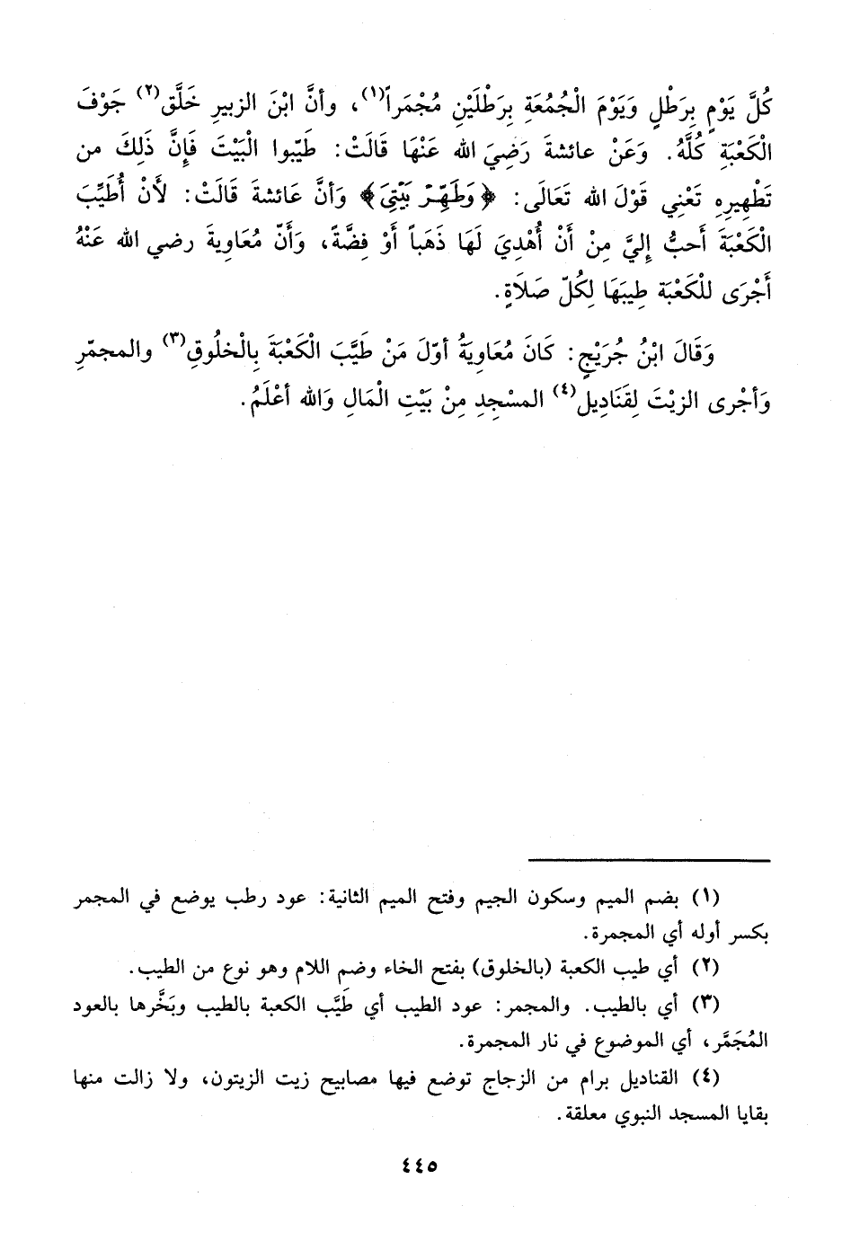 وَقَالَ ابْنُ جُرَيْجٍ: كَانَ مُعَاوِيةُ أوّلَ مَنْ طَيَّبَ الْكَعْبةَ بِالْخلُوقِ (¬3) والمجمّرِ وَأجْرى الزيْتَ لِقَنَادِيل (¬4) المسْجِدِ مِنْ بَيْتِ الْمَالِ وَالله أعْلَمُ.
