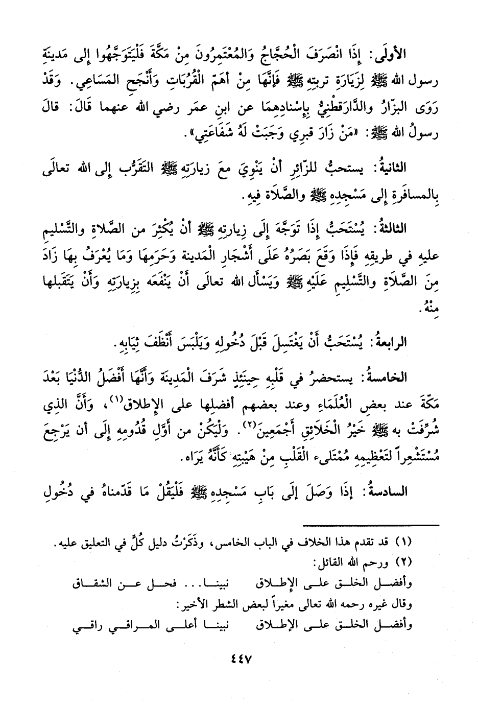 الأولَى: إذَا انْصَرَفَ الْحُجاجُ وَالمُعْتَمِرُونَ مِنْ مَكةَ فَلْيَتَوَجهُوا إلى مَدينة رسول الله - صلى الله عليه وسلم - لِزَيَارَةِ تربتِهِ - صلى الله عليه وسلم - فَإنهَا مِنْ أهَم الْقُرُبَاتِ وَأَنْجَحِ المَسَاعِي. وَقَدْ رَوَى البزارُ والدارَقطْنِي بِإِسْنادهمَا عن ابنِ عمَر رضي الله عنهما قَالَ: قالَ رسولُ الله - صلى الله عليه وسلم -: "مَنْ زَارَ قبرِي وَجَبَتْ لَهُ شَفَاعَتِي".