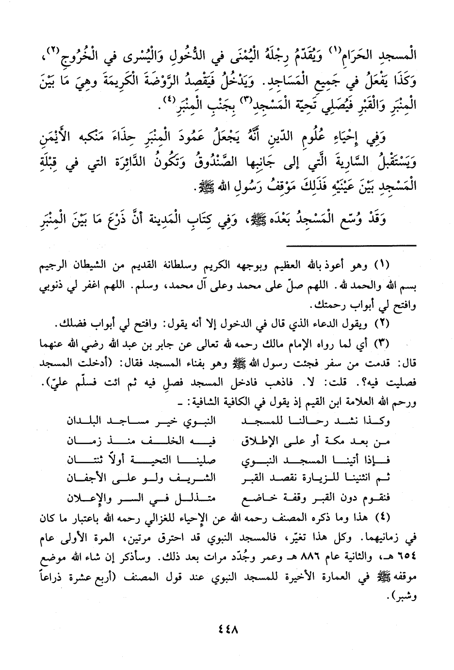 (¬4) هذا وما ذكره المصنف رحمه الله عن الإِحياء للغزالي رحمه الله باعتبار ما كان في زمانيهما. وكل هذا تغير، فالمسجد النبوي قد احترق مرتين، المرة الأولى عام 654 هـ والثانية عام 886 هـ وعمر وجُدّد مرات بعد ذلك. وسأذكر إن شاء الله موضع موقفه - صلى الله عليه وسلم - في العمارة الأخيرة للمسجد النبوي عند قول المصنف (أربع عشرة ذراعاً وشبر).