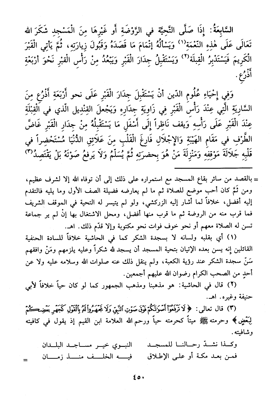 (¬3) قال تعالى: {لَا تَرْفَعُوا أَصْوَاتَكُمْ فَوْقَ صَوْتِ النَّبِيِّ وَلَا تَجْهَرُوا لَهُ بِالْقَوْلِ كَجَهْرِ بَعْضِكُمْ لِبَعْضٍ} [الحجرات: 2] وحرمته - صلى الله عليه وسلم - ميتاً كحرمته حياً ورحم الله العلامة ابن القيم إذ يقول في كافيته وشافيته: