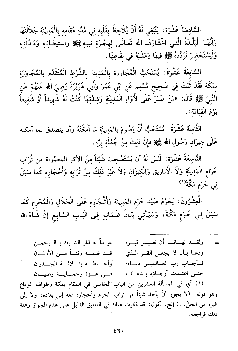 السَّابِعَةَ عَشْرَةَ: يُسْتَحَبُّ الْمُجَاورة بِالْمَدِينة بِالشَّرْطِ الْمُتَقَدّمِ بالْمُجَاوَرَةِ بِمَكّة فَقَدْ ثَبَتَ فِي صَحِيحِ مُسْلِم عَنِ ابْنِ عُمَرَ وَأَبي هُرَيْرَةَ رَضِيَ الله عَنْهُمْ عَنِ النَّبِيّ - صلى الله عليه وسلم - قَالَ: "مَنْ صَبَرَ عَلَى لأوَاءِ الْمَدِيْنةِ وَشِدَّتِهَا كُنْتُ لَهُ شَهِيداً أوْ شَفِيعاً يَوْمَ الْقِيَامَةِ".