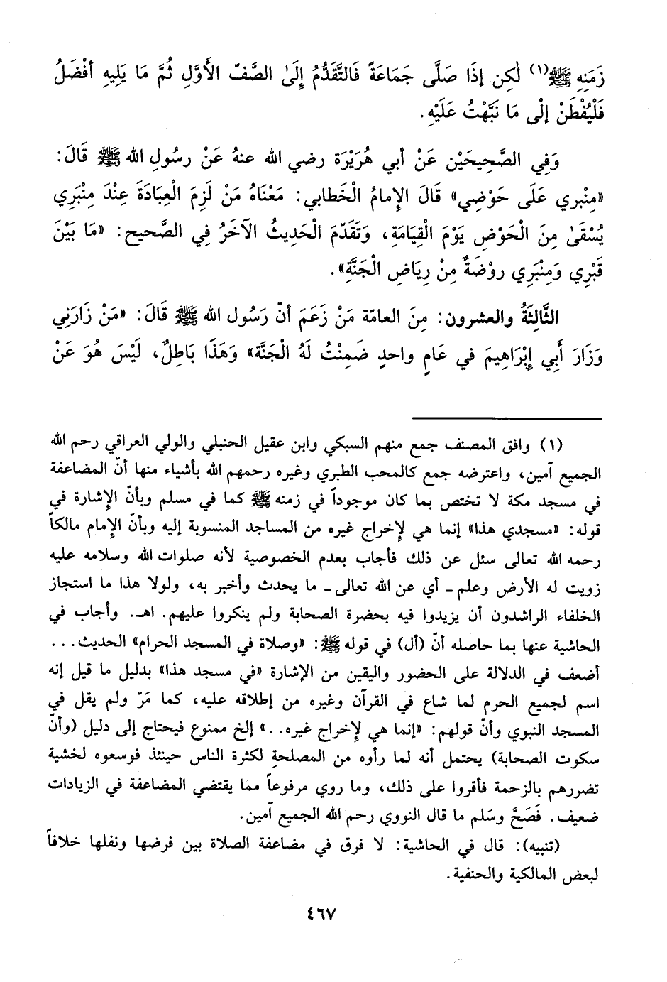 الثالِثَةُ والعشرون: مِنَ العامّة مَنْ زَعَمَ أنّ رَسُول الله - صلى الله عليه وسلم - قَالَ: "مَنْ زَارَنِي وَزَارَ أَبِي إبْرَاهِيمَ في عَام واحد ضَمِنْتُ لَهُ الْجَنَّة" وَهَذَا بَاطِلٌ، لَيْسَ هُوَ عَنْ