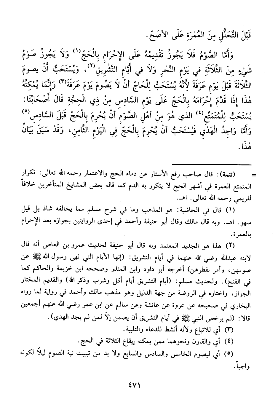 (¬2) هذا هو الجديد المعتمد وبه قال أبو حنيفة لحديث عمرو بن العاص أنه قال لابنه عبد الله رضي الله عنهما في أيام التشريق: (إنها الأيام التي نهى رسول الله - صلى الله عليه وسلم - عن صومهن، وأمر بفطرهن) أخرجه أبو داود وابن المنذر وصححه ابن خزيمة والحاكم كما في الفتح). ولحديث مسلم: (أيام التشريق أيام أكل وشرب وذكر الله) والقديم المختار الجواز، واختاره في الروضة من جهة الدليل وهو مذهب مالك وأحمد في رواية لما رواه البخاري في صحيحه عن عروة عن عائشة وعن سالم عن ابن عمر رضي الله عنهم أجمعين قالا: (لم يرخص النبي - صلى الله عليه وسلم - في أيام التشريق أن يصمن إلا لمن لم يجد الهدي).