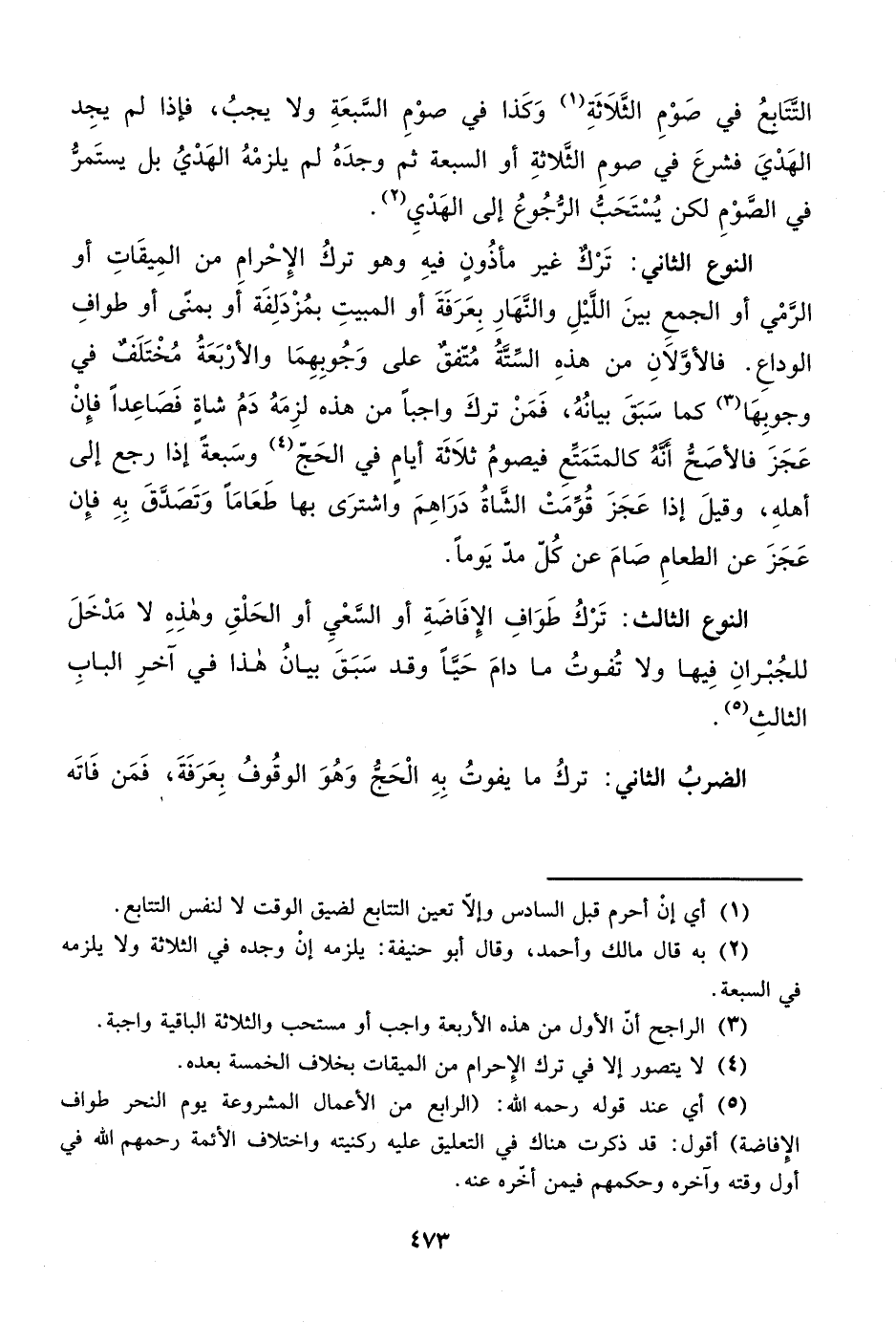 النوع الثالث: تَرْكُ طَوَافِ الإِفَاضَةِ أو السَعْيِ أو الحَلْقِ وهذه لا مَدْخَلَ للجُبْرانِ فِيها ولا تُفوتُ ما دامَ حَياً وقد سَبَقَ بيانُ هذا في آخرِ البابِ الثالثِ (¬5).