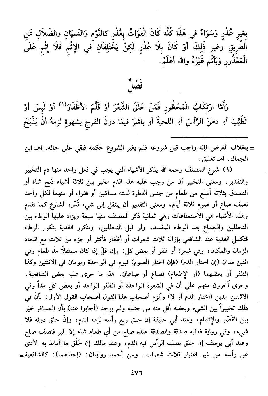 (¬1) شرع المصنف رحمه الله يذكر الأشياء التي يجب في فعل واحد منها دم التخيير والتقدير. ومعنى التخيير أن من وجب عليه هذا الدم مخير بين ثلاثة أشياء ذبح شاة أو التصدق بثلاثة آصع من طعام من جنس الفطرة لستة مساكين أو فقراء أو منهما لكل واحد نصف صاع أو صوم ثلاثة أيام، ومعنى التقدير أن ينتقل إلى شيء قَدّره الشارع كما تقدم وهذه الأشياء هي الاستمتاعات وهي ثمانية ذكر المصنف منها سبعة ويزاد عليها الوطء بين التحللين والجماع بعد الوطء المفسد، ولو قبل التحللين، وتتكرر الفدية بتكرر الوطء فتكمل الفدية عند الشافعي بإزالة ثلاث شعرات أو أظفار فأكثر أو جزء من ثلاث مع اتحاد الزمان والمكان، وفي شعرة أو ظفر أو بعض كل: وإن قل إذا كان مستقلاً مد طعام وفي اثنين مدان (إن اختار الدم) (فإن اختار الصوم) فيوم في الواحدة ويومان في الاثنتين وكذا الظفر أو بعضهما (أو الإِطعام) فصاع أو صاعان. هذا ما جرى عليه بعض الشافعية.