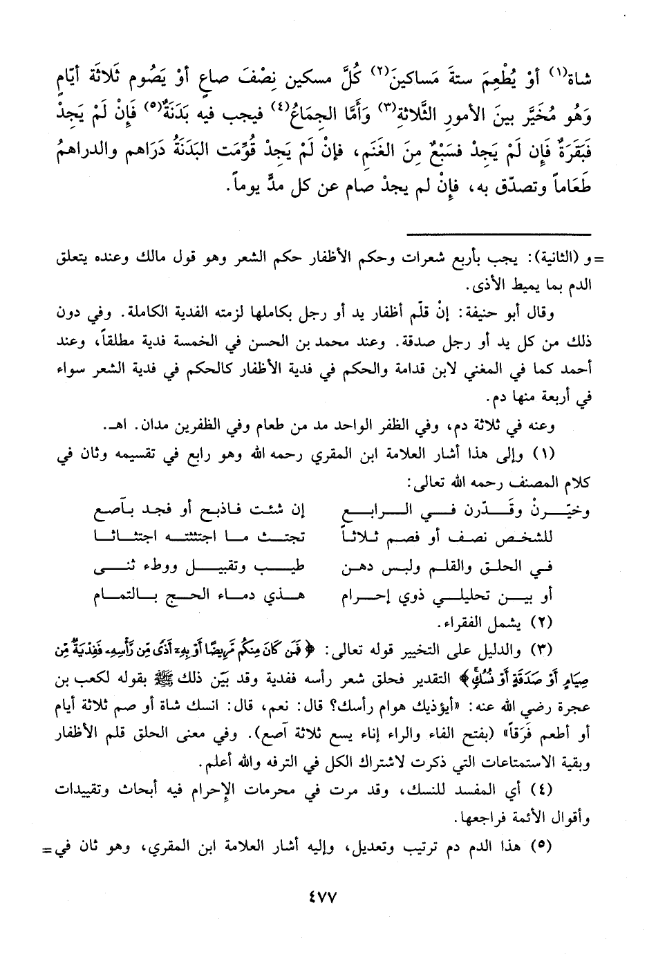 (¬3) والدليل على التخيير قوله تعالى: {فَمَنْ كَانَ مِنْكُمْ مَرِيضًا أَوْ بِهِ أَذًى مِنْ رَأْسِهِ فَفِدْيَةٌ مِنْ صِيَامٍ أَوْ صَدَقَةٍ أَوْ نُسُكٍ} [البقرة: 196] التقدير فحلق شعر رأسه ففدية وقد بين ذلك - صلى الله عليه وسلم - بقوله لكعب بن عجرة رضيِ الله عنه: "أيؤذيك هوام رأسك؟ قال: نعم، قال: انسك شاة أو صم ثلاثة أيام أو أطعم فرَقاً" (بفتح الفاء والراء إناء يسع ثلاثة آصع). وفي معنى الحلق قلم الأظفار وبقية الاستمتاعات التي ذكرت لاشتراك الكل في الترفه والله أعلم.