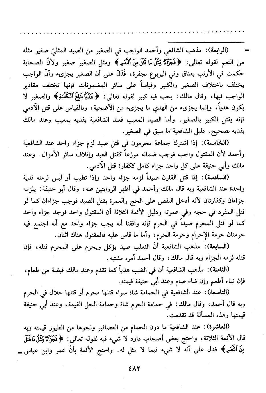 (الخامسة): إذا اشترك جماعة محرمون في قتل صيد لزم جزاء واحد عند الشافعية وأحمد لأن المقتول واجب فوجب ضمانه موزعاً كقتل العبد وإتلاف سائر الأموال. وعند مالك وأبي حنيفة على كل واحد جزاء كامل ككفارة قتل الآدمي.