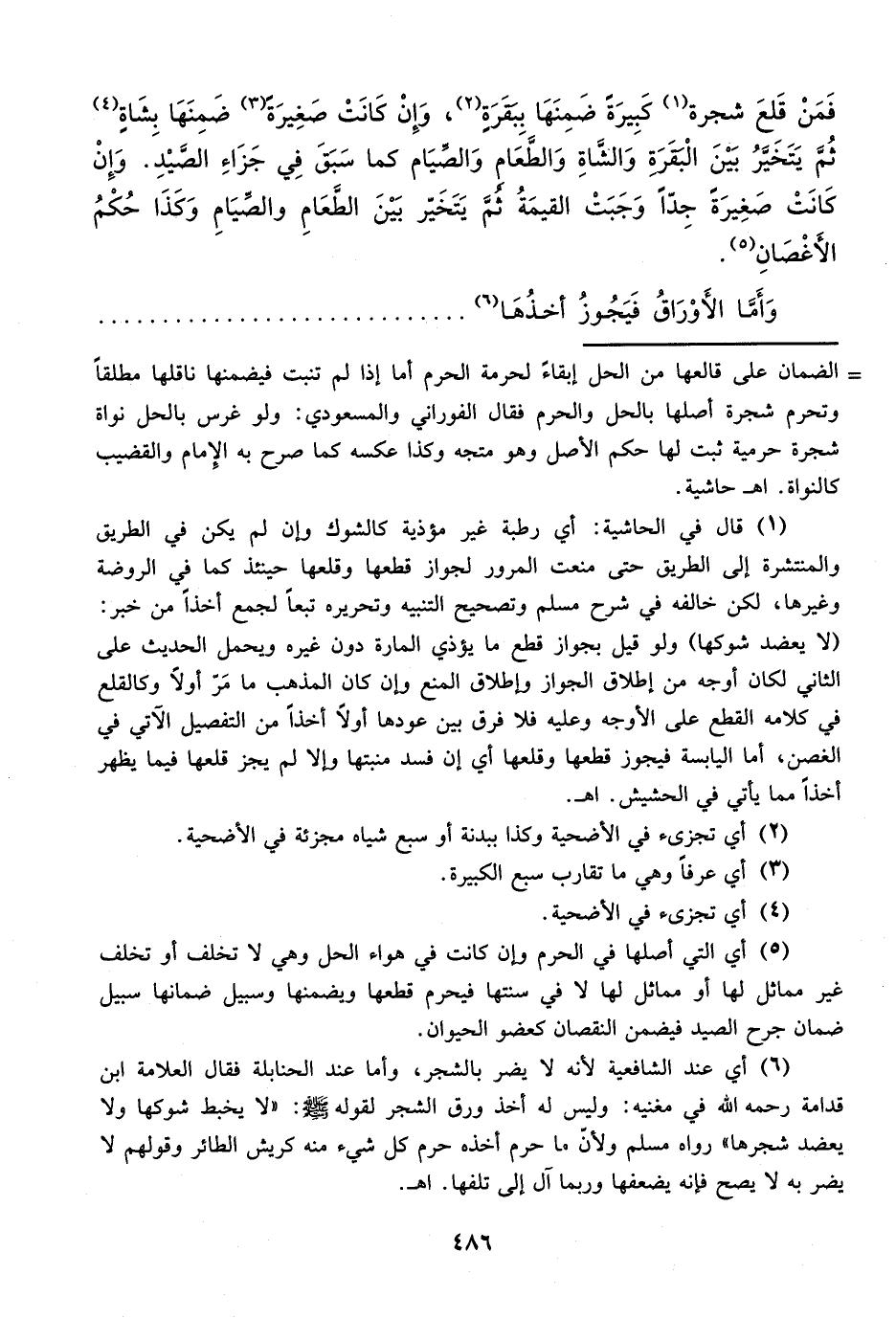 (¬6) أي عند الشافعية لأنه لا يضر بالشجر، وأما عند الحنابلة فقال العلامة ابن قدامة رحمه الله في مغنيه: وليس له أخذ ورق الشجر لقوله - صلى الله عليه وسلم -: "لا يخبط شوكها ولا يعضد شجرها" رواه مسلم ولأن ما حرم أخذه حرم كل شيء منه كريش الطائر وقولهم لا يضر به لا يصح فإنه يضعفها وربما آل إلى تلفها. اهـ.