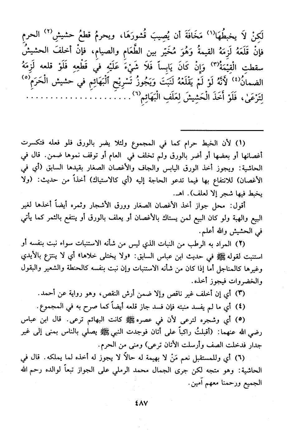 (¬5) أي وشجره لترعى لأن في عصره - صلى الله عليه وسلم - كانت البهائم ترعى. قال ابن عباس رضي الله عنهما: (أقبلتُ راكباً على أتان فوجدت النبي - صلى الله عليه وسلم - يصلي بالناس بمنى إلى غير جدار فدخلت الصف وأرسلت الأتان ترعى) ومنى من الحرم.