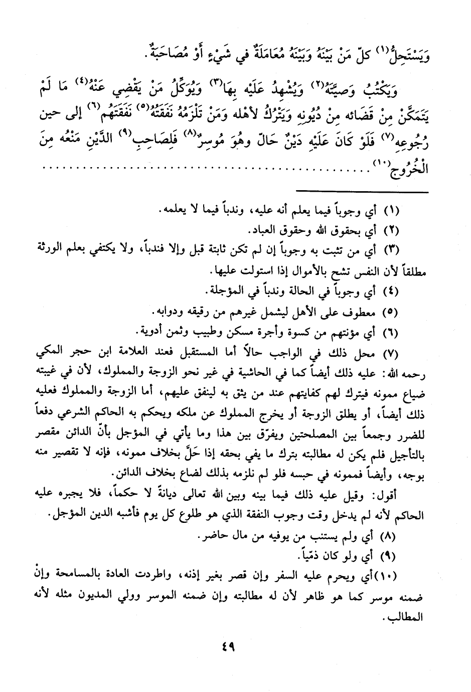 (¬7) محل ذلك في الواجب حالاً أما المستقبل فعند العلامة ابن حجر المكي رحمه الله: عليه ذلك أيضاً كما في الحاشية في غير نحو الزوجة والمملوك، لأن في غيبته ضياع ممونه فيترك لهم كفايتهم عند من يثق به لينفق عليهم، أما الزوجة والمملوك فعليه ذلك أيضاً، أو يطلق الزوجة أو يخرج المملوك عن ملكه ويحكم به الحاكم الشرعي دفعاً للضرر وجمعاً بين المصلحتين ويفرّق بين هذا وما يأتي في المؤجل بأن الدائن مقصر بالتأجيل فلم يكن له مطالبته بترك ما يفي بحقه إذا حَلَّ بخلاف ممونه، فإنه لا تقصير منه بوجه، وأيضاً فممونه في حبسه فلو لم نلزمه بذلك لضاع بخلاف الدائن.