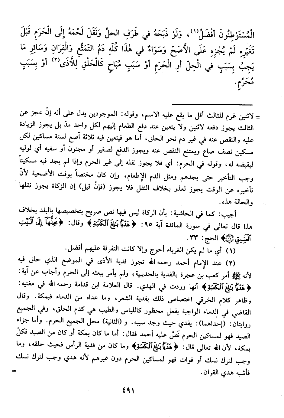 (¬2) عند الإمام أحمد رحمه الله تجوز فدية الأذى في الموضع الذي حلق فيه لأنه - صلى الله عليه وسلم - أمر كعب بن عجرة بالفدية بالحديبية، ولم يأمر ببعثه إلى الحرم وأجاب عن آية: {هَدْيًا بَالِغَ الْكَعْبَةِ} أنها وردت في الهدي. قال العلامة ابن قدامة رحمه الله في مغنيه: وظاهر كلام الخرقي اختصاص ذلك بفدية الشعر، وما عداه من الدماء فبمكة. وقال القاضي في الدماء الواجبة بفعل محظور كاللباس والطيب هي كدم الحلق، وفي الجميع روايتان: (إحداهما): يفدي حيث وجد سببه. و (الثانية) محل الجميع الحرم. وأما جزاء الصيد فهو لمساكين الحرم نَصَّ عليه أحمد فقال: أما ما كان بمكة أو كان من الصيد فكل بمكة، لأن الله تعالى قال: {هَدْيًا بَالِغَ الْكَعْبَةِ} وما كان من فدية الرأس فحيث حلقه، وما وجب لترك نسك أو فوات فهو لمساكين الحرم دون غيرهم لأنه هدي وجب لترك نسك فأشبه هدي القران. =