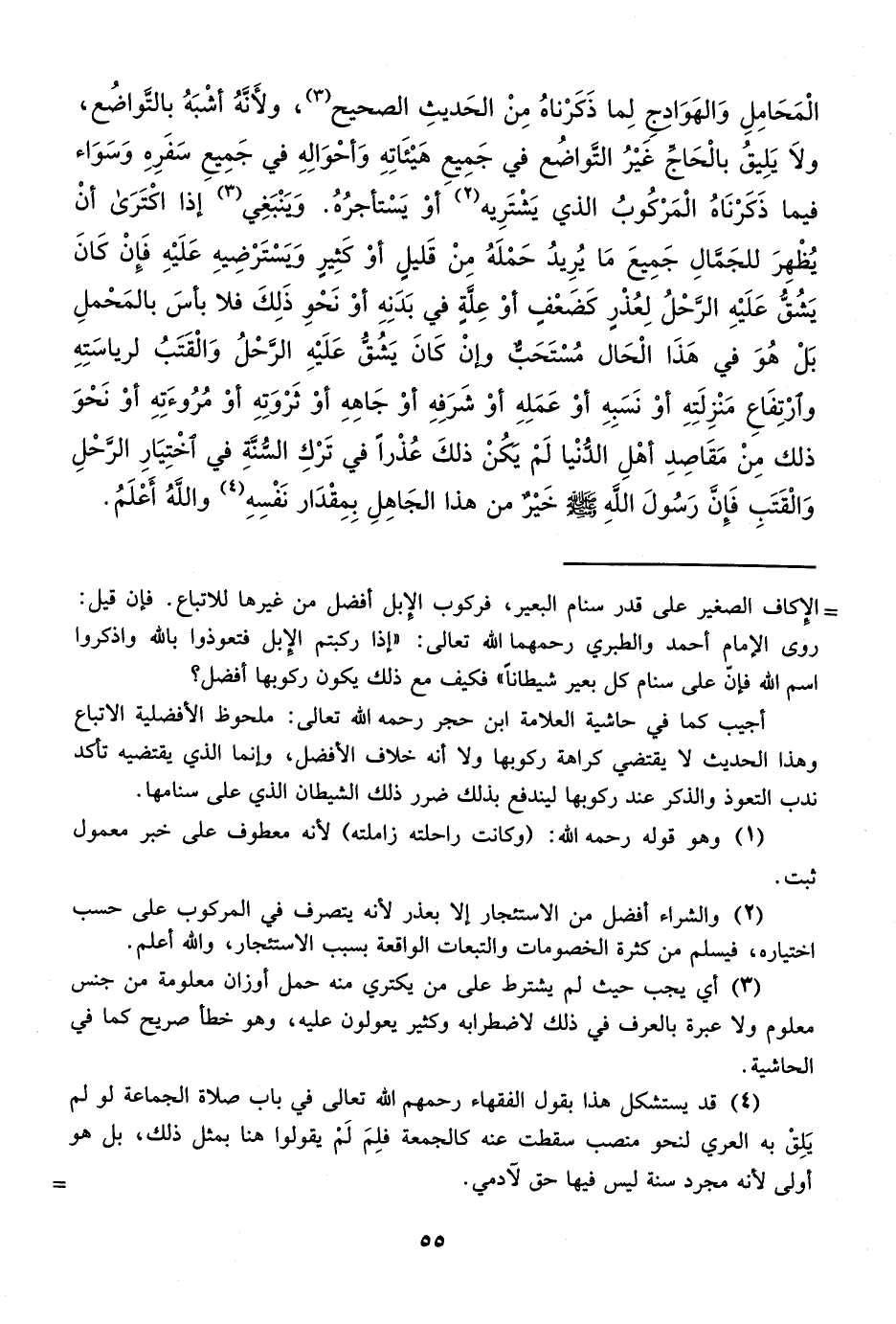 الْمَحَامِلِ وَالهَوَادج لِما ذَكَرْناهُ مِنْ الحَديثِ الصحيح (¬1)، ولأَنَّهُ أشْبَهُ بالتواضُع، ولاَ يَلِيقُ بالْحَاج غَيْرُ التواضُع في جَمِيعِ هَيْئَاتِهِ وَأحْوَالِهِ في جَمِيعِ سَفَرِهِ وَسَوَاء فيما ذَكَرْنَاهُ الْمَرْكُوبُ الذي يَشْتَرِيه (¬2) أوْ يَسْتأجرُهُ. وَيَنْبَغِي (¬3) إذا اكْتَرَى أنْ يُظْهِرَ للجَمَّالِ جَمِيعَ مَا يُرِيدُ حَمْلَهُ مِنْ قَليل أوْ كَثِير وَيَسْتَرْضِيهِ عَلَيْهِ فَإِنْ كَانَ يَشُق عَلَيْهِ الرَحْلُ لِعُذْر كَضَعْفِ أوْ عِلَّةِ في بَدَنِهِ أوْ نَحْوِ ذَلِكَ فلا بأسَ بالمَحْملِ بَلْ هُوَ في هَذَا الْحَال مُسْتَحَب وإنْ كَانَ يَشُق عَلَيْهِ الرَحْلُ وَالْقَتَبُ لرياسَتِهِ وارْتِفَاعِ مَنْزِلَتِهِ أوْ نَسَبِهِ أوْ عَمَلِهِ أوْ شَرَفِهِ أوْ جَاهِهِ أوْ ثَرْوَتِهِ أوْ مُرُوءَتِهِ أوْ نَحْوَ ذلك مِنْ مَقَاصِدِ أهْلِ الدُّنْيا لَمْ يَكُنْ ذلكَ عُذْراً في تَرْكِ السُنةِ في اخْتِيَارِ الرَّحْلِ وَالْقَتَبِ فَانَّ رَسُولَ اللهِ - صلى الله عليه وسلم - خَيْرٌ من هذا الجَاهِلِ بِمِقْدَار نَفْسِهِ (¬4) واللهُ أَعْلَمُ.