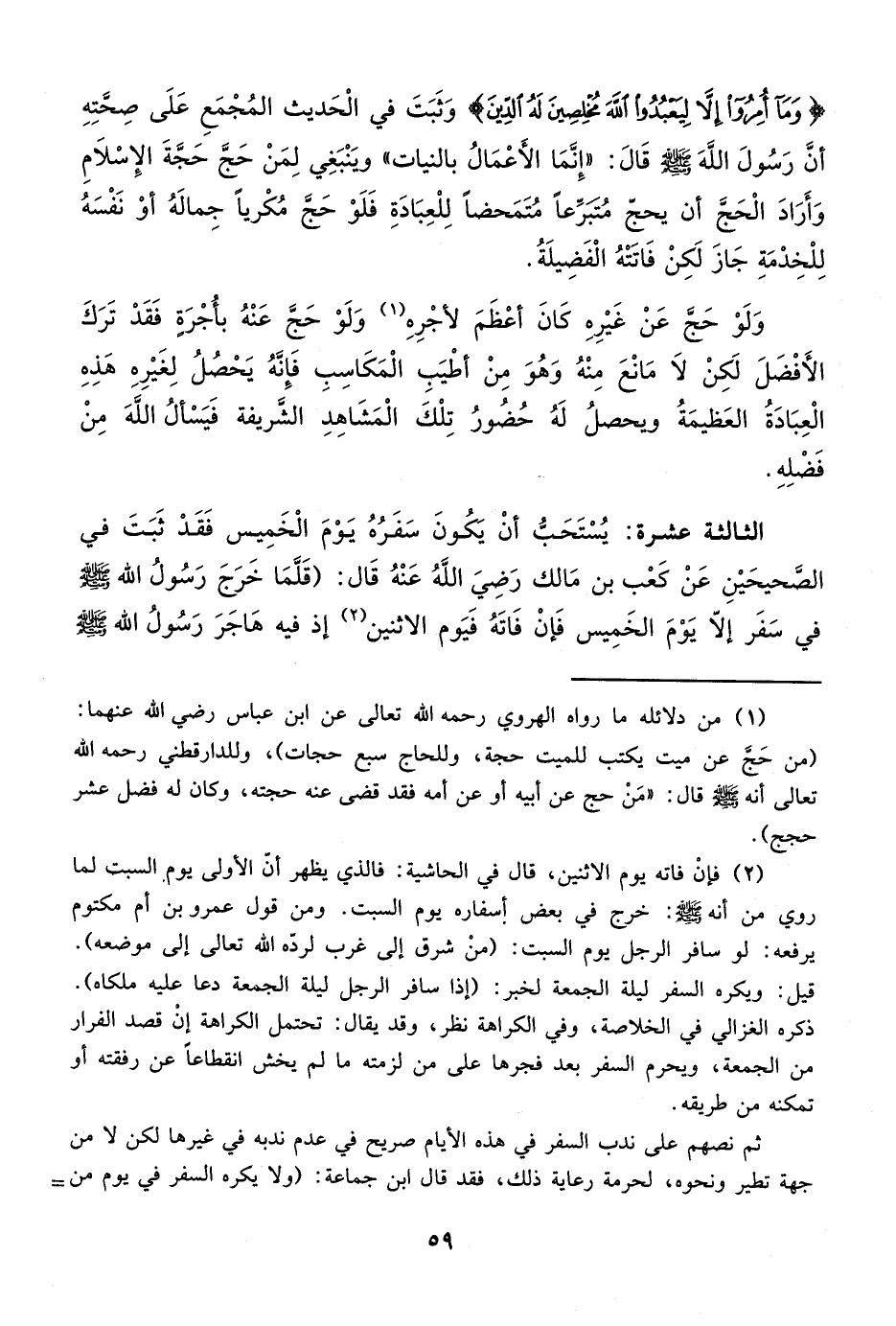 الثالثة عشرة: يُسْتَحَب أنْ يَكُونَ سَفَرُهُ يَوْمَ الْخَمِيس فَقَدْ ثَبَتَ في الصَحيحَيْنِ عَنْ كَعْب بن مَالك رَضِيَ اللهُ عَنْهُ قَال: (قَلَّمَا خَرَجَ رَسُولُ الله - صلى الله عليه وسلم - في سَفَر إلا يَوْمَ الخَمِيس فَإنْ فَاتَهُ فَيَوم الاثنين (¬2) إذ فيه هَاجَرَ رَسُولُ الله - صلى الله عليه وسلم -