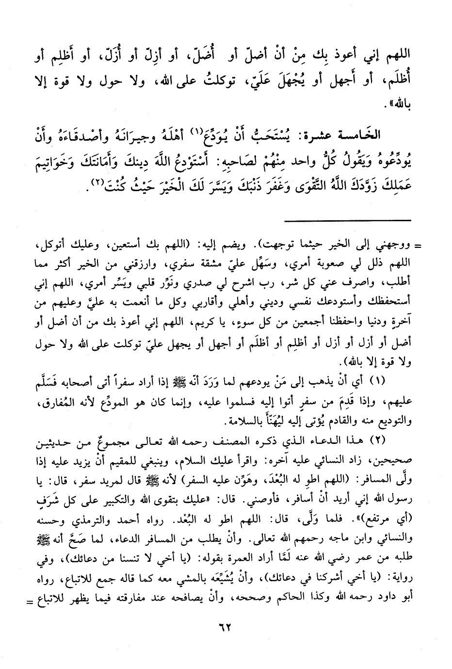 الخَامسة عشرة: يُسْتَحَب أَنْ يُوَدع (¬1) أهْلَهُ وجيرَانَهُ وأصْدقَاءَهُ وأَنْ يُودِّعُوهُ وَيقُولُ كُل واحد مِنْهُمْ لصَاحبِهِ: أَسْتَوْدع اللَّهَ دِينكَ وَأَمَانتَكَ وَخَوَاتِيمَ عَمَلِكَ زَوَّدَكَ اللَّهُ التقْوَى وَغَفَرَ ذَنْبَكَ وَيَسَّرَ لَكَ الْخَيْرَ حَيْثُ كُنْتَ (¬2).