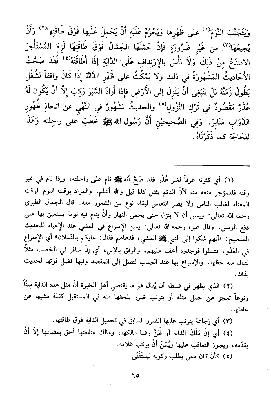 وَيَتَجَنَّبَ النَّوْمَ (¬1) على ظَهْرِها وَيَحْرُمُ عَلَيْهِ أَنْ يَحْمِلَ عَلَيها فَوْقَ طَاقَتِها (¬2) وَأَنْ يُجيعَهَا (¬3) من غَيْرِ ضَرُورَةِ فَإنْ حَمَّلَهَا الجَمَّالُ فَوْقَ طَاقَتِهَا لَزِمَ المُسْتَأْجرَ الامتنَاعُ مِنْ ذَلِكَ وَلاَ بَأسَ بالإِرْتِدافِ عَلَى الدابةِ إذَا أَطَاقَتْهُ (¬4) فقَدْ صَحَّتْ الأَحَاديثُ المَشْهُورَةُ في ذلك ولا يَمْكُثُ على ظَهْرِ الدابة إِذَا كَانَ واقفاً لشُغْل يَطُولُ زَمَنُهُ بَلْ يَنْبَغِي أنْ يَنْزِلَ إلى الأَرْضِ فإِذا أَرادَ السَّيْرَ رَكِبَ إِلاّ أنْ يَكُون لَهُ عُذْرٌ مَقْصُودٌ في تَرْكِ النزُولِ (¬5) والحديثُ مَشْهُورٌ في النَّهْيِ عن اتخاذِ ظُهُورِ الدَّوَابِ مَنَابِرَ. وَفِي الصحيحيْنِ أَنَّ رَسُول الله - صلى الله عليه وسلم - خَطَبَ على راحِلته وَهَذَا للحَاجَة كما ذَكَرْنَاهُ.