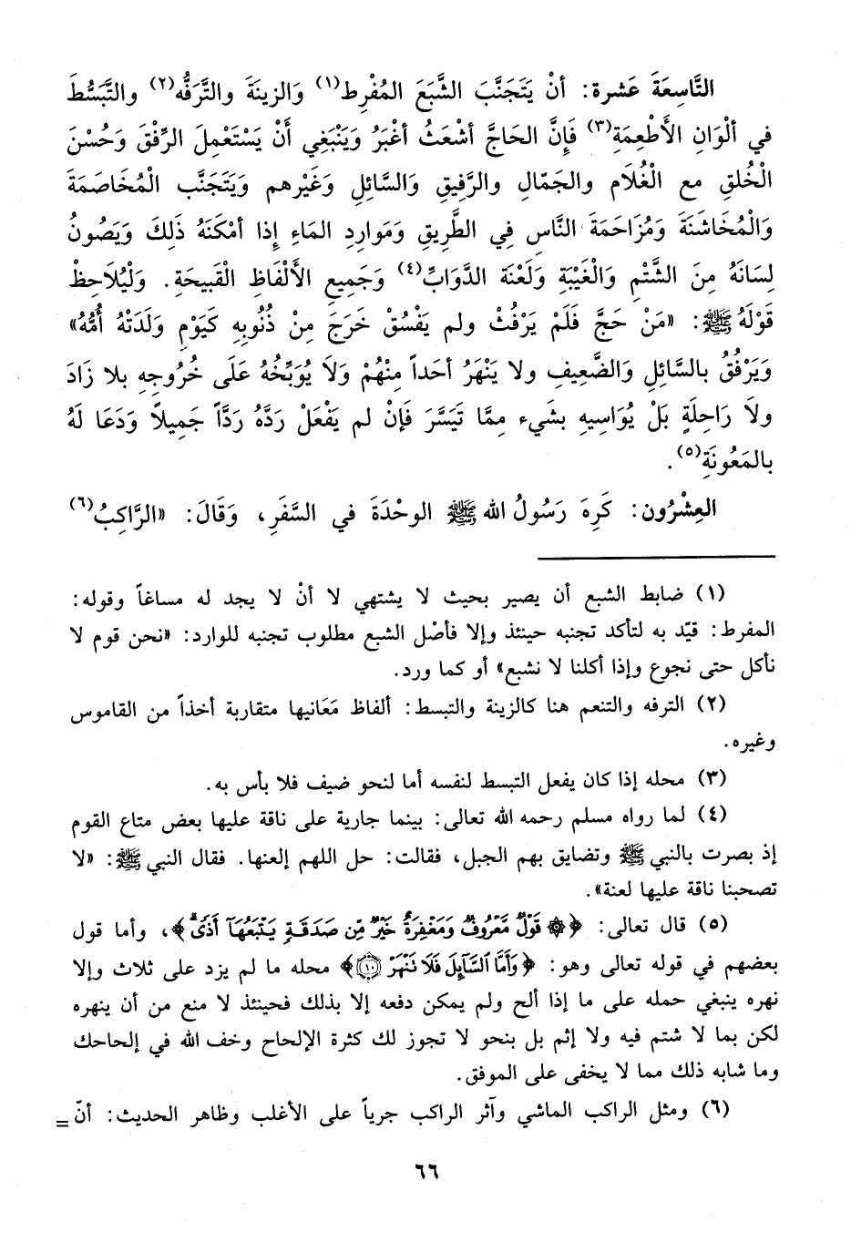 التَّاسِعَةَ عَشرة: أنْ يَتَجَنَّبَ الشَّبَعَ المُفْرِط (¬1) وَالزينَةَ والتَّرَفُّه (¬2) والتَّبَسُّطَ في ألْوَانِ الأَطْعِمَةِ (¬3) فَإِنَ الحَاجَ أشْعَثُ أغْبَرُ وَيَنْبَغِي أَنْ يَسْتَعْمِلَ الرِّفْقَ وَحُسْنَ الْخُلقِ مع الْغُلاَم والجَمّالِ والرَفِيقِ وَالسَّائِلِ وَغَيْرهم وَيَتَجَنَّب الْمُخَاصَمَةَ وَالْمُخَاشَنَةَ وَمُزَاحَمَةَ النَاسِ فِي الطَّرِيقِ وَمَوارِدِ المَاءِ إِذا أمْكَنَهُ ذَلِكَ وَيَصُونُ لِسَانَهُ مِنَ الشَّتْمِ وَالْغَيْبَةِ وَلَعْنَة الدَوَاب (¬4) وَجَمِيعِ الأَلْفَاظِ الْقَبيحَةِ. وَلْيُلاَحِظْ قَوْلَهُ - صلى الله عليه وسلم -: "مَنْ حَج فَلَمْ يَرْفُثْ ولم يَفْسُقْ خَرَجَ مِنْ ذُنُوبِهِ كيَوْمِ وَلَدَتْهُ أُمُه" وَيَرْفُقُ بالسَّائِلِ وَالضعِيفِ ولا يَنْهَرُ أحَداً مِنْهُمْ وَلاَ يُوَبخُهُ عَلَى خُرُوجهِ بلا زَادَ ولاَ رَاحِلَة بَلْ يُوَاسِيهِ بشَيء مِمَّا تَيَسَّرَ فَإنْ لم يَفْعَلْ رَدَّهُ رَدَّا جَمِيلاً وَدَعَا لَهُ بالمَعُونَةِ (¬5).