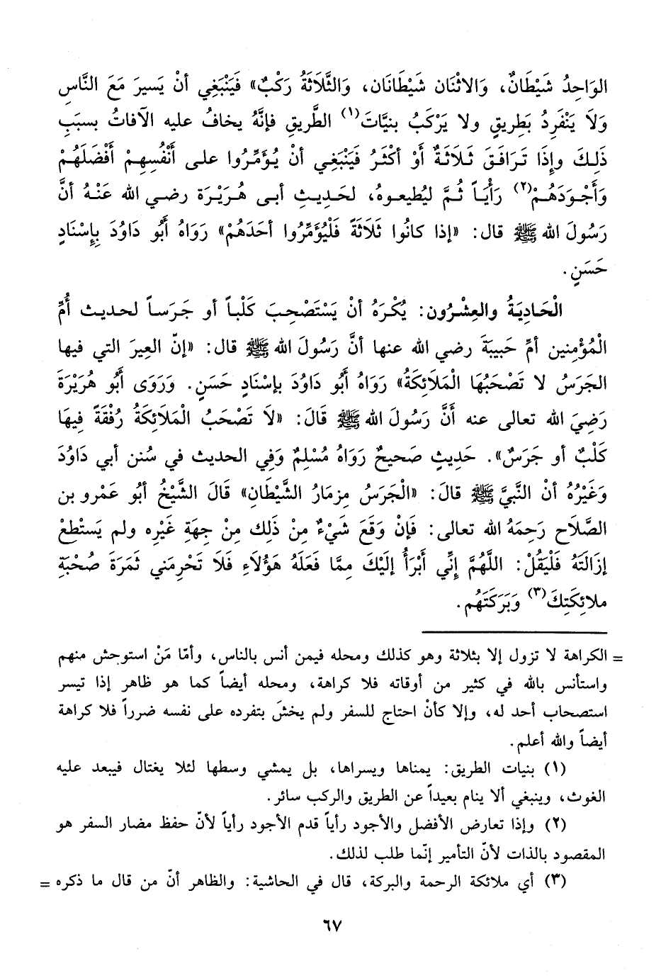 الْحَادِيَةُ والعِشْرُون: يُكْرَهُ أنْ يَسْتَصْحِبَ كَلْباً أو جَرَساً لحديث أمِّ الْمُؤْمِنين أم حَبيبةَ رضي الله عنها أنَّ رَسُولَ الله - صلى الله عليه وسلم - قال: "إنّ العِيرَ التي فيها الجَرَسُ لا تَصْحَبُهَا الْمَلاَئِكَةُ" رَوَاهُ أَبُو دَاوُدَ بإسْنَادٍ حَسَنٍ. وَرَوَى أَبُو هُرَيْرَةَ رَضِيَ الله تعالى عنه أن رَسُولَ الله - صلى الله عليه وسلم - قَالَ: "لاَ تَصْحَبُ الْمَلاَئِكَةُ رُفْقَةً فِيهَا كَلْب أو جَرَسٌ". حَدِيثٍ صَحيحٌ رَوَاهُ مُسْلِمٌ وَفِي الحديث في سُنن أبي دَاوُدَ وَغَيْرُهُ أنْ النَبيَّ - صلى الله عليه وسلم - قالَ: "الْجَرَسُ مِزمَارُ الشَّيْطَانِ" قَالَ الشَّيْخُ أبُو عَمْرو بن الصَّلاَح رَحِمَهُ الله تعالى: فَإنْ وَقَعَ شَيْءٌ مِنْ ذَلِك مِنْ جِهَةِ غيْرِه ولم يَستْطعْ إزَالتهُ فَلْيقُلْ: اللَهُمَّ إِنَي أَبْرَأُ إلَيْكَ مِمَّا فَعَلَهُ هَؤُلاَءِ فَلاَ تَحْرِمَني ثَمَرَةَ صُحْبةِ ملائِكَتِكَ (¬3) وَبَرَكَتَهُم.