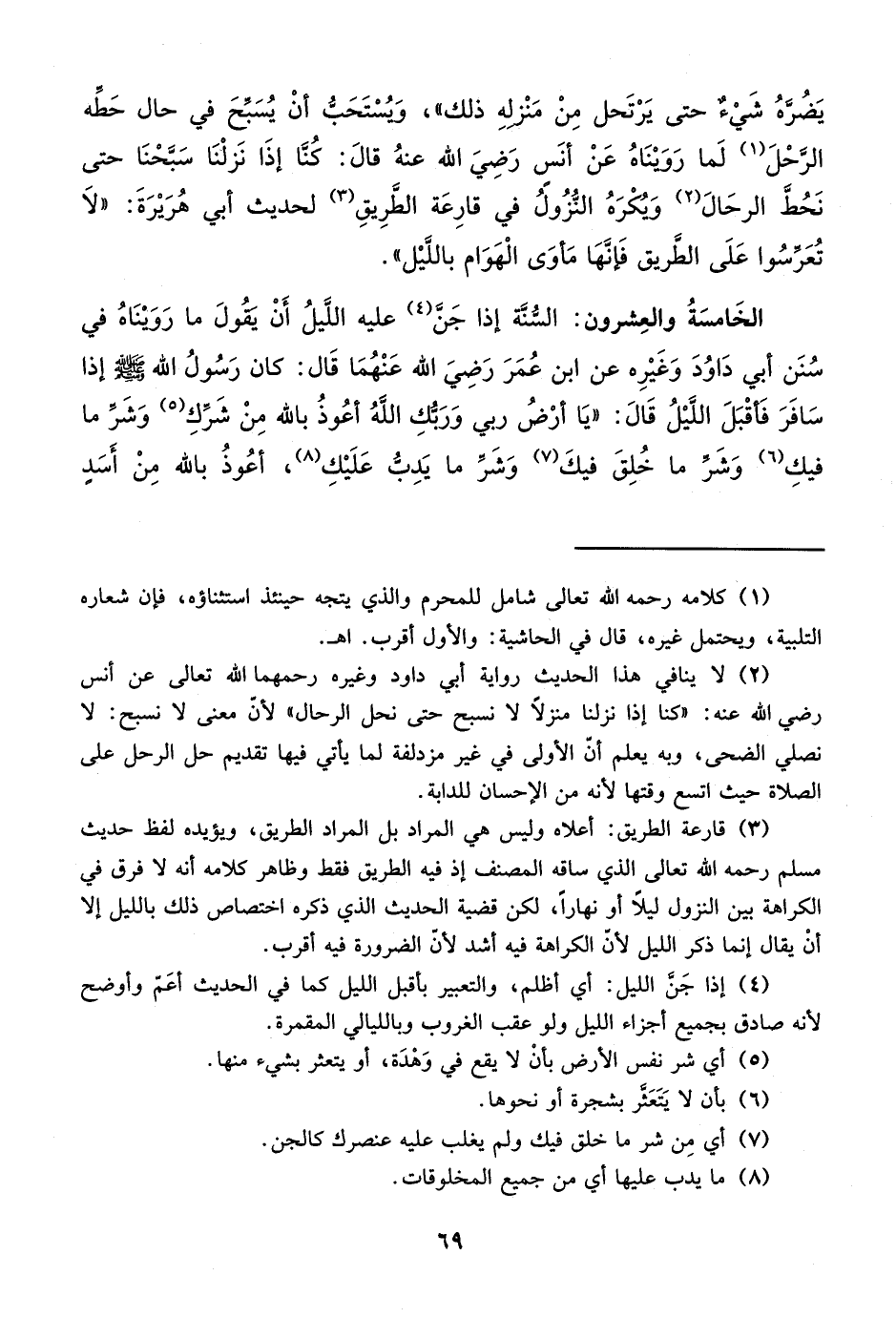 يَضُرهُ شَيْءٌ حتى يَرْتحل مِنْ مَنْزلهِ ذلك"، وَيُسْتَحَبُّ أنْ يُسَبحَ في حال حَطِّه الرَّحْلَ (¬1) لَما رَوَيْنَاهُ عَنْ أنَس رَضِيَ الله عنهُ قالَ: كُنا إذَا نَزلْنَا سَبحْنَا حتى نَحُط الرحَالَ (¬2) وَيُكْرَهُ النُّزُولُ في قارِعَة الطَرِيقِ (¬3) لحديث أبي هُرَيْرَةَ: "لاَ تُعَرسُوا عَلَى الطَّريق فَإنَّهَا مَأوَى الْهَوَام باللَّيْل".