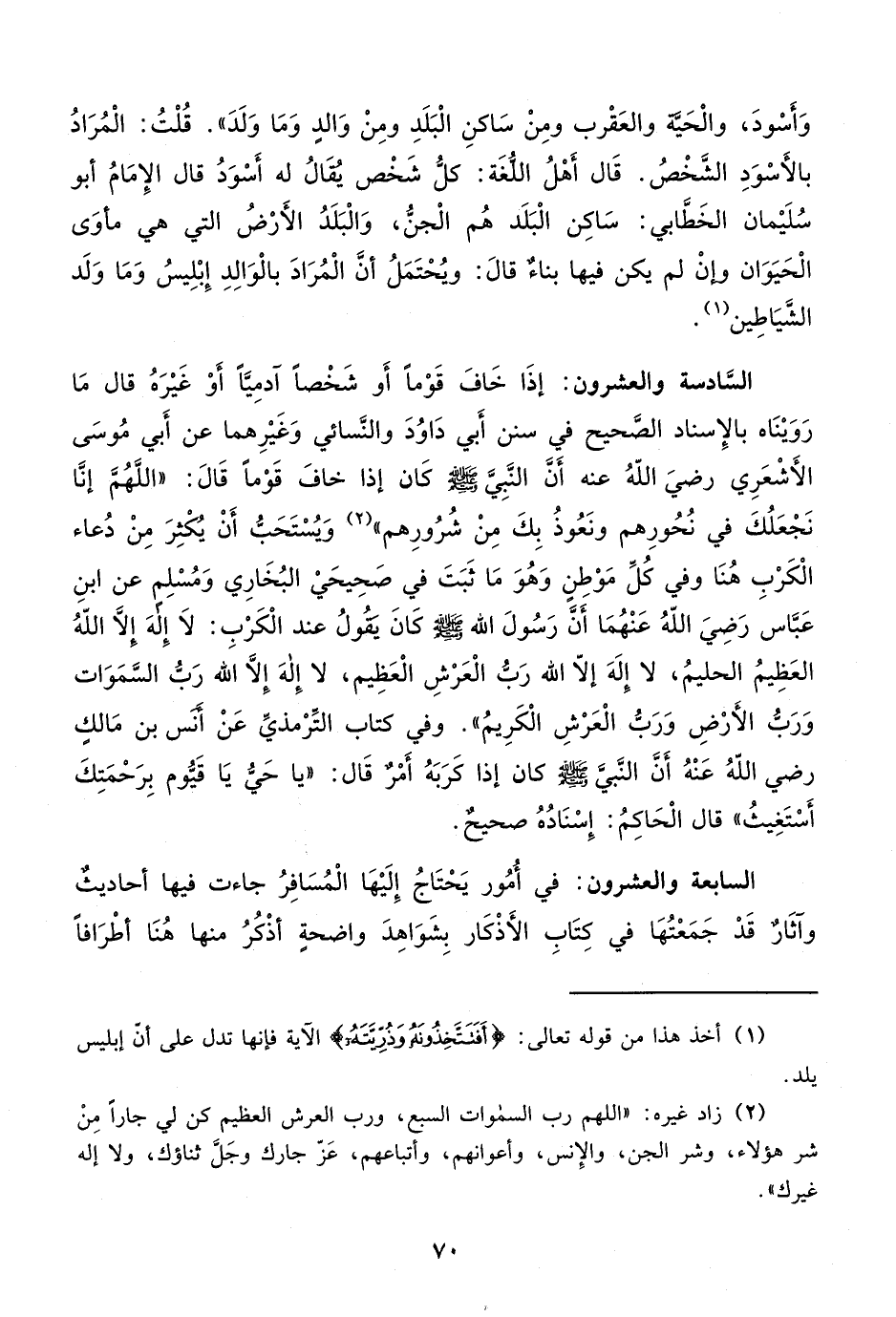 السابعة والعشرون: في أُمُور يَحْتَاجُ إِلَيْهَا الْمُسَافِرُ جاءت فيها أحاديثٌ وآثَار قَدْ جَمَعْتُهَا في كِتَابِ الأَذْكَار بِشَوَاهِدَ واضحة أذْكُرُ منها هُنَا أطْرَافاً