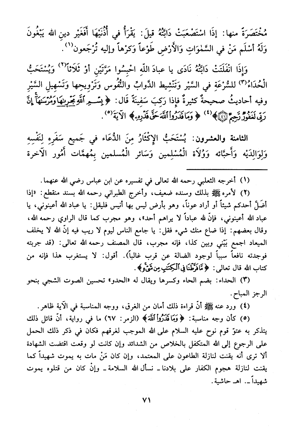 وَإِذَا انْفَلَتَتْ دَابَّتُهُ نَادَى يا عبادَ اللهِ احْبِسُوا مَرَّتَيْنِ أوْ ثَلاَثاً (¬2) وَيُسْتَحَبُّ الْحُدَاءُ (¬3) للسُّرْعَةِ في السَّيْر وَتَنْشِيط الدَّوابِّ والنُفُوس وَتَرْوِيحِها وَتَسْهِيلِ السَّيْرِ وفيه أحاديثُ صحيحةٌ كثيرةٌ فإِذا رَكِبَ سَفِينَةً قَال: {بِسْمِ اللَّهِ مَجْرَاهَا وَمُرْسَاهَا إِنَّ رَبِّي لَغَفُورٌ رَحِيمٌ (41)} [هود: 41] (¬4) {وَمَا قَدَرُوا اللَّهَ حَقَّ قَدْرِهِ} الآيةَ (¬5).