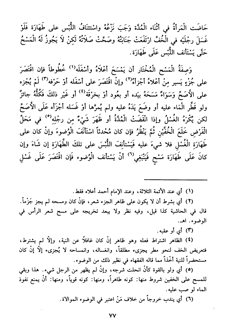 (¬5) أي ولو بالقوة كأنْ انحلت شرجه، وإنْ لم يظهر من الرجل شيء. هذا وبقي للمسح على الخفين شروط منها: كونه طاهراً، ومنها: كونه قوياً، ومنها: أنْ يمنع نفوذ الماء لو صب عليه.