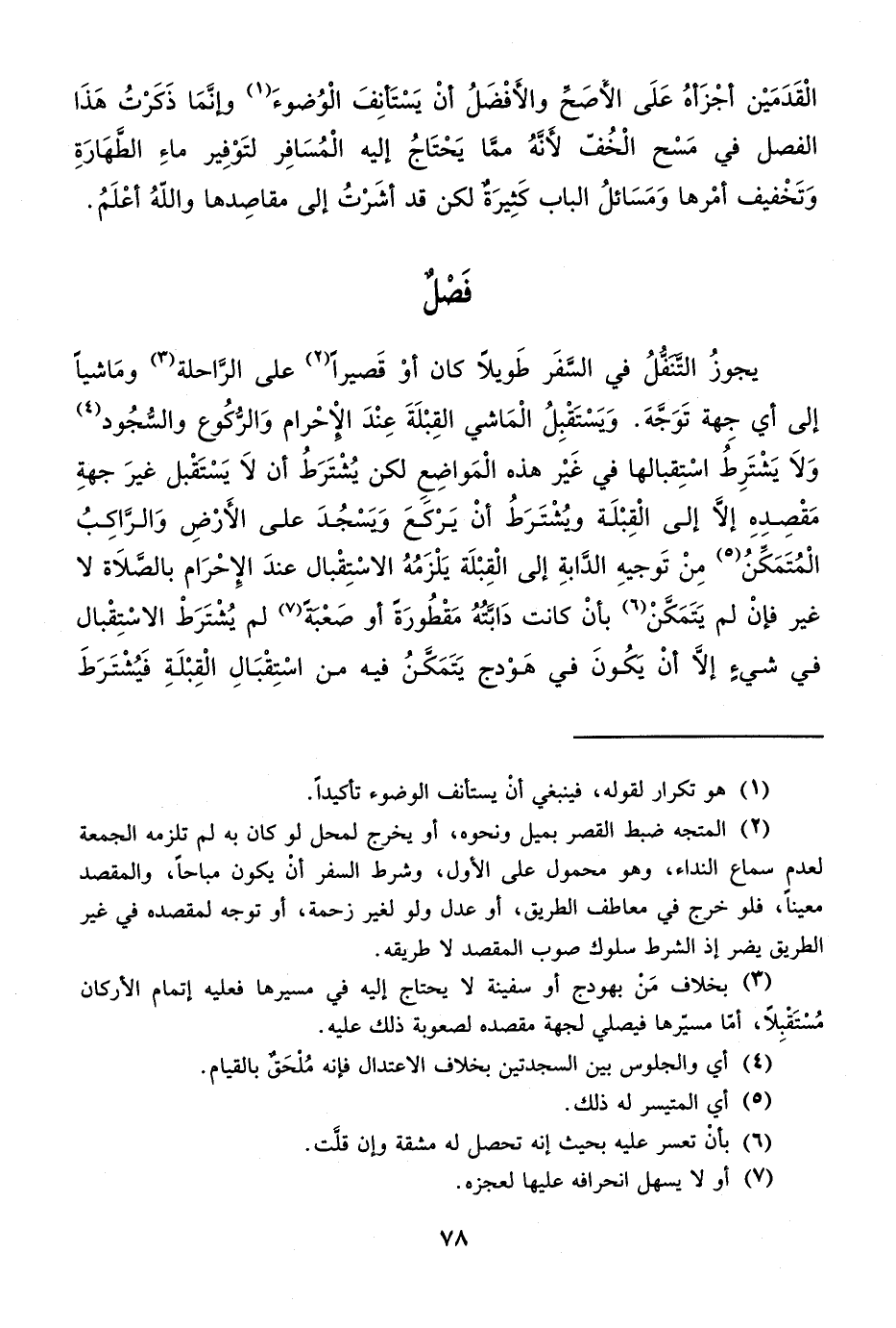 يجوزُ التنفلُ في السَفَر طَويلاً كان أوْ قَصيراً (¬2) على الرَّاحلة (¬3) ومَاشياً إلى أي جِهة تَوَجَّهَ. وَيَسْتَقْبِلُ الْمَاشي القِبْلَةَ عِنْدَ الإِْحْرام وَالرُكُوع والسُّجُود (¬4) وَلاَ يَشْتَرِطُ اسْتِقبالها في غَيْر هذه الْمَواضِعِ لكن يُشْتَرَطُ أن لاَ يَسْتَقْبل غيرَ جهةِ مَقْصِدِهِ إلا إلى الْقِبْلَة ويُشْتَرَطُ أنْ يَرْكَعَ وَيَسْجُدَ على الأَرْضِ وَالرَّاكِبُ الْمُتَمَكِّنُ (¬5) مِنْ تَوجيهِ الدابةِ إلى الْقِبْلَة يَلْزَمُهُ الاسْتِقْبال عندَ الإِحْرَام بالصَلاَة لا غير فإنْ لم يَتَمَكَّنْ (¬6) بأنْ كانت دابتُهُ مَقْطُورَةً أو صَعْبةً (¬7) لم يُشْتَرَطْ الاسْتِقْبال في شيءٍ إلاَّ أنْ يَكُونَ في هَوْدج يَتَمَكَنُ فيه من اسْتِقْبَالِ الْقِبْلَةِ فَيُشْتَرَطَ