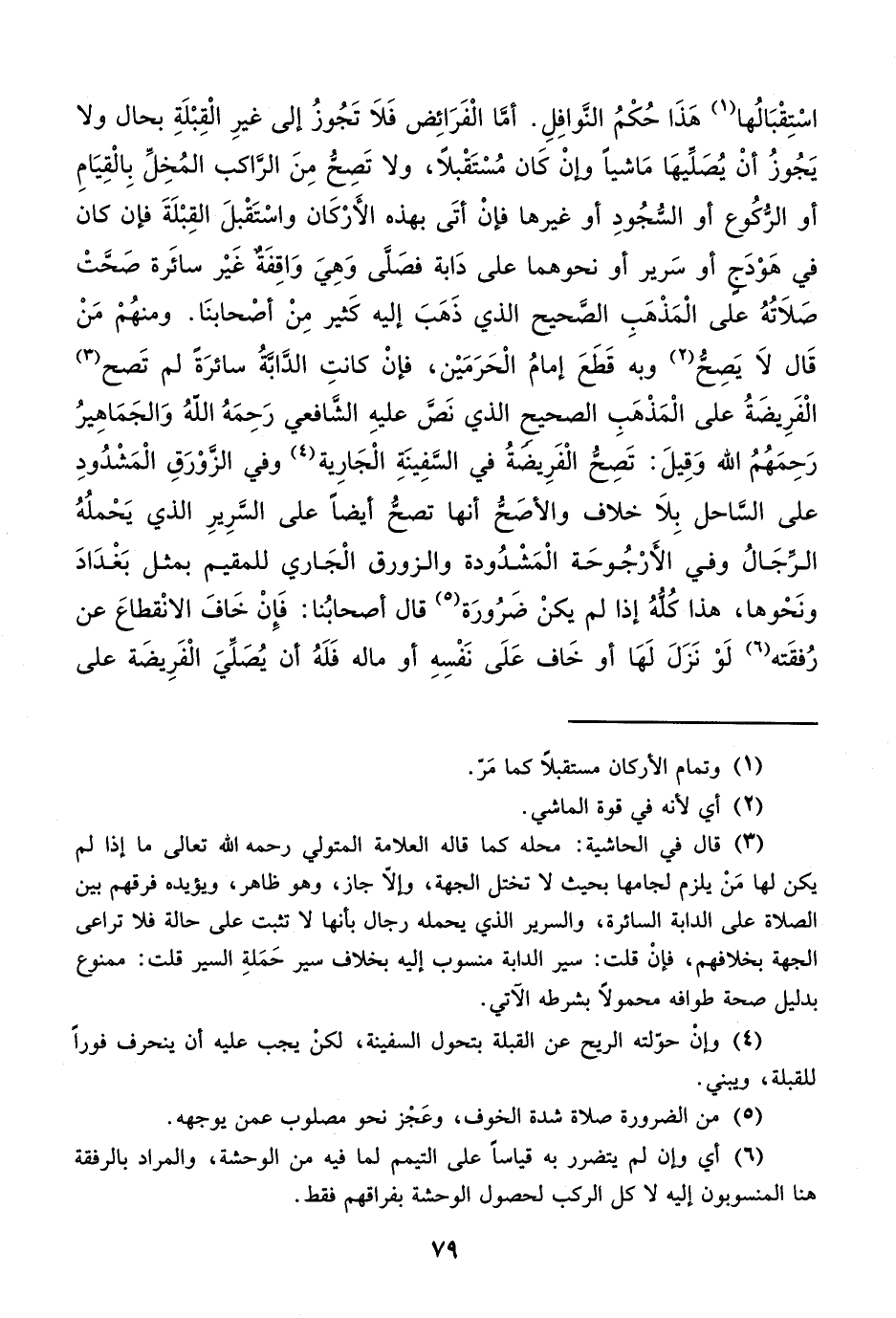 اسْتِقْبَالُها (¬1) هَذَا حُكْمُ النَّوافِلِ. أمَّا الْفَرَائِض فَلاَ تَجُوزُ إلى غيرِ الْقِبْلَةِ بحال ولا يَجُوزُ أنْ يُصَلِّيهَا مَاشياً وإنْ كَان مُسْتَقْبلاً، ولا تَصِحُّ مِنَ الراكب المُخِل بِالْقِيَامِ أو الرُّكُوع أو السُّجُودِ أو غيرها فإنْ أتَى بهذه الأَرْكَان واسْتَقْبلَ القِبْلَةَ فإن كان في هَوْدَجٍ أو سَرير أو نحوهما على دَابة فصَلَّى وَهِيَ وَاقِفَة غَيْر سائَرة صَحَّتْ صَلاَتُهُ على الْمَذْهبِ الصَّحيح الذي ذَهَبَ إليه كَثير مِنْ أصْحابنَا. ومنهُمْ مَنْ قَال لاَ يَصِحُّ (¬2) وبه قَطَعَ إمامُ الْحَرَمَيْن، فإنْ كانتِ الدَّابة سائرَةً لم تَصح (¬3) الْفَرِيضَةُ على الْمَذْهَبِ الصحيح الذي نَصَّ عليهِ الشَّافعي رَحِمَهُ اللهُ وَالجَمَاهِيرُ رَحِمَهُمُ الله وَقِيلَ: تَصِح الْفَرِيضةُ في السَّفِينَةِ الْجَارِية (¬4) وفي الزوْرَقِ الْمَشْدُودِ على السَّاحل بِلاَ خلاف والأصَحُ أنها تصحُ أيضاً على السَّرِيرِ الذي يَحْملُهُ الرِّجَالُ وفي الأَرْجُوحَة الْمَشْدُودة والزورق الْجَاري للمقيم بمثل بَغْدَادَ ونَحْوها، هذا كُلُّهُ إذا لم يكنْ ضَرُورَة (¬5) قال أصحابُنا: فَإِنْ خَافَ الانْقطاعَ عن رُفقَته (¬6) لَوْ نَزَلَ لَهَا أو خَاف عَلَى نَفْسِهِ أو ماله فَلَهُ أن يُصلِّيَ الْفَرِيضَة على