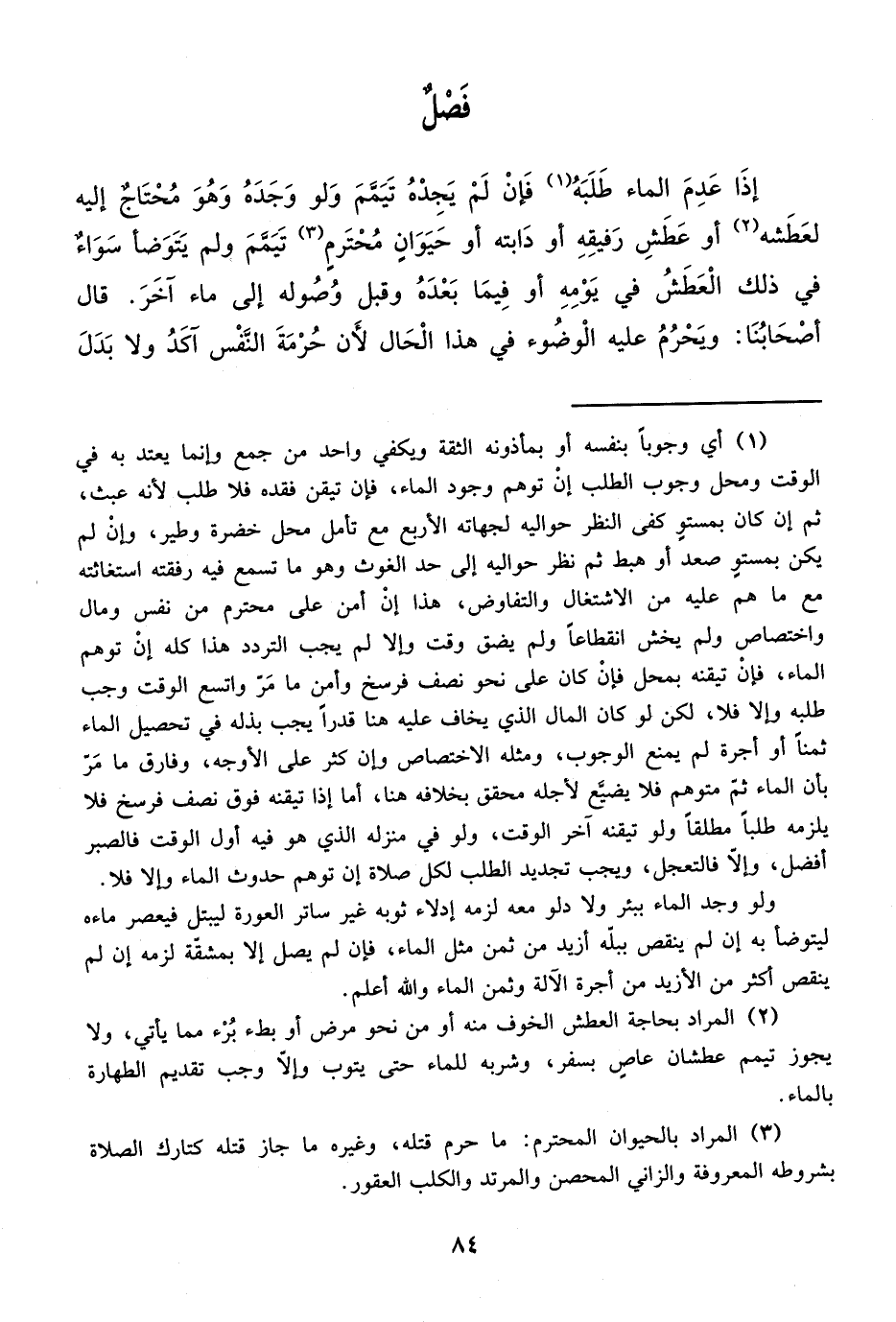 إذَا عَدِمَ الماء طَلَبَهُ (¬1) فَإنْ لَمْ يَجِدْهُ تَيممَ وَلو وَجَدَهُ وَهُوَ مُحْتَاجٌ إليه لعَطَشه (¬2) أو عَطَشِ رَفيقِهِ أو دابته أو حَيَوَانٍ مُحْتَرمِ (¬3) تَيَمَّمَ ولم يَتَوَضأ سَوَاءٌ في ذلك الْعَطَشُ في يَوْمِهِ أو فِيمَا بَعْدَهُ وقبل وُصُوله إلى ماء آخَرَ. قال أصْحَابُنَا: ويَحْرُمُ عليه الْوضُوء في هذا الْحَال لأَن حُرْمَةَ النَّفْس آكَدُ ولا بَدَلَ