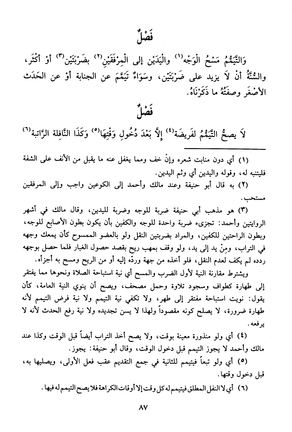 (¬3) هو مذهب أبي حنيفة ضربة للوجه وضربة لليدين، وقال مالك في أشهر الروايتين وأحمد: تجزىء ضربة واحدة للوجه والكفين بأن يكون بطون الأصابع للوجه، وبطون الراحتين للكفين، والمراد بضربتين النقل ولو بالعضو الممسوح كأن يمعك وجهه في التراب، ومِنْ يد إلى يد، ولو وقف بمهب ريح بقصد حصول الغبار فلما حصل بوجهه ردده لم يكف لعدم النقل، فلو أخذه من جهة وردّه إليه أو من الريح ومسح به أجزأه.