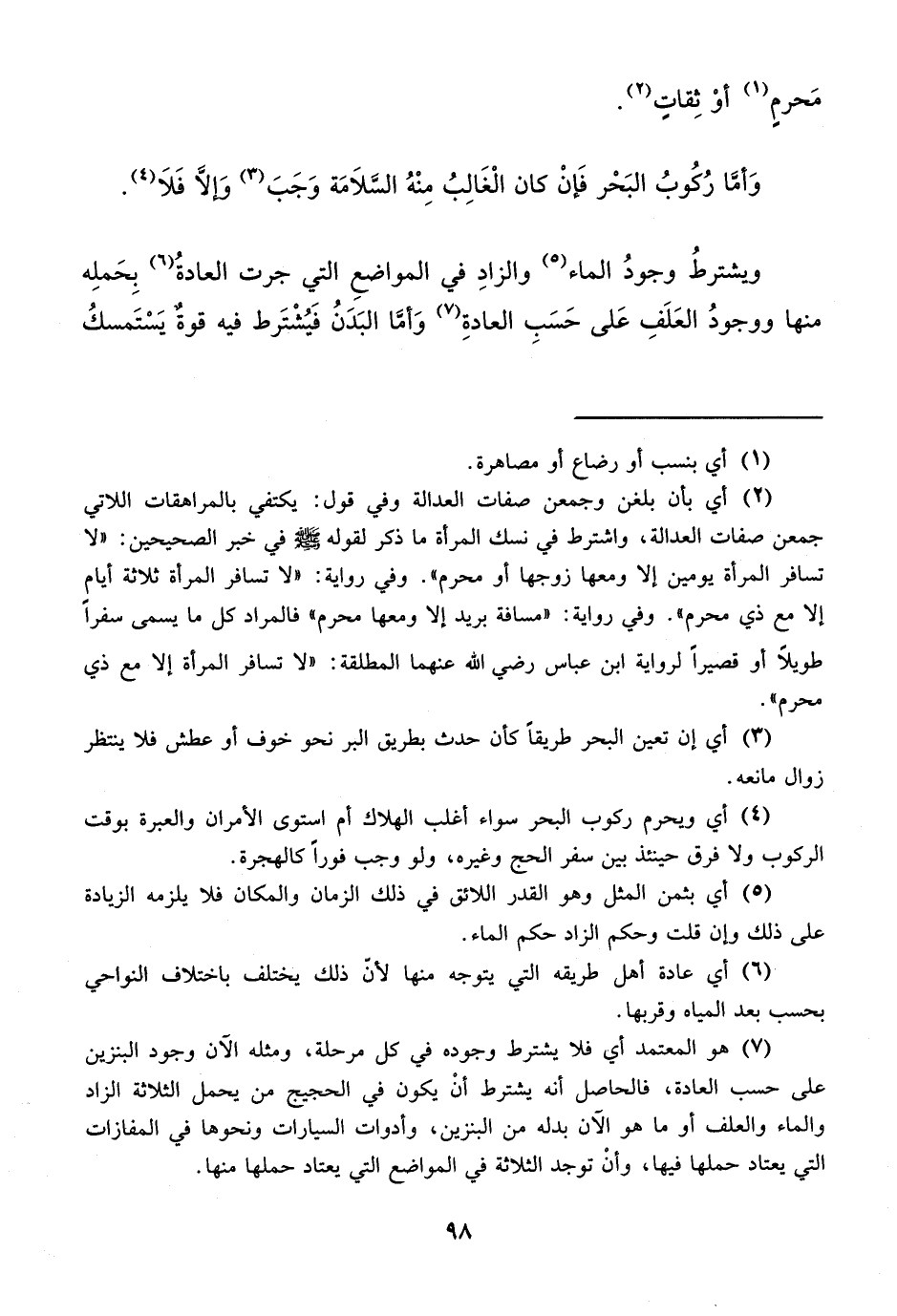 (¬7) هو المعتمد أي فلا يشترط وجوده في كل مرحلة، ومثله الآن وجود البنزين على حسب العادة، فالحاصل أنه يشترط أنْ يكون في الحجيج من يحمل الثلاثة الزاد والماء والعلف أو ما هو الآن بدله من البنزين، وأدوات السيارات ونحوها في المفازات التي يعتاد حملها فيها، وأنْ توجد الثلاثة في المواضع التي يعتاد حملها منها.