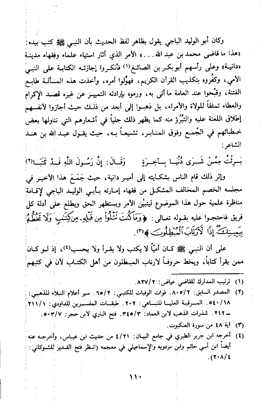 وإثر ذلك قام الناس بشكايته إلى أمير دانية، حيث جَمَعَ هذا الأخير في مجلسه الخصم المخالف المشكل من فقهاء إمارته بأبي الوليد الباجي لإقامة مناظرة علمية حول هذا الموضوع ليتبيَّن الأمر ويستظهر الحق ويطلع على أدلة كل فريق فاحتجوا عليه بقوله تعالى: {وَمَا كُنْتَ تَتْلُو مِنْ قَبْلِهِ مِنْ كِتَابٍ وَلَا تَخُطُّهُ بِيَمِينِكَ إِذًا لَارْتَابَ الْمُبْطِلُونَ} (¬3).