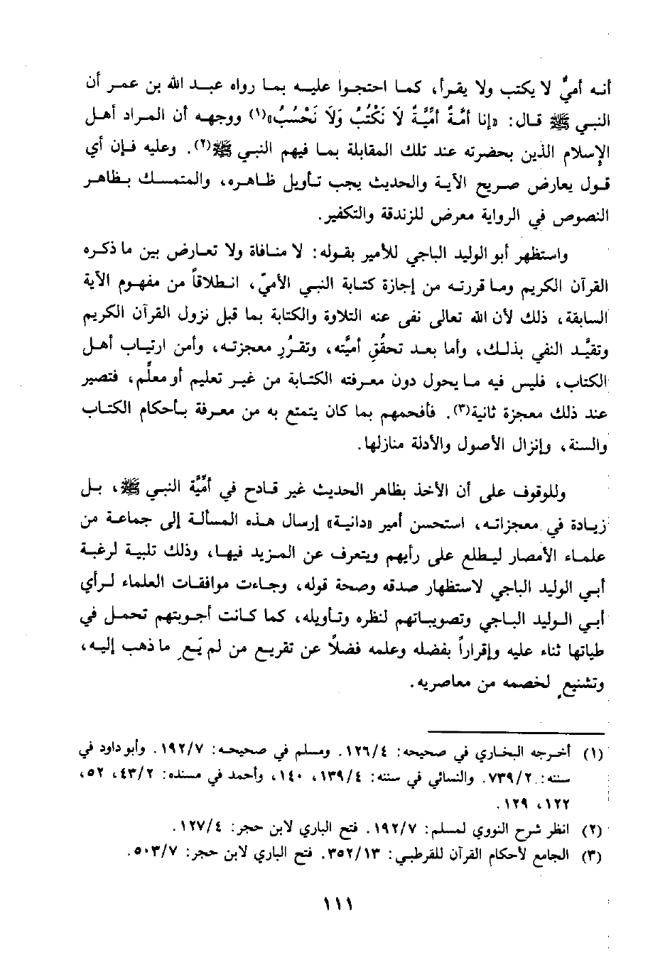 واستظهر أبو الوليد الباجي للأمير بقوله: لا منافاة ولا تعارض بين ما ذكره القرآن الكريم وما قررته من إجازة كتابة النبي الأميّ، انطلاقًا من مفهوم الآية السابقة، ذلك لأن الله تعالى نفى عنه التلاوة والكتابة بما قبل نزول القرآن الكريم وتقيَّد النفي بذلك، وأما بعد تحقُّقِ أميَّته، وتقرُّرِ معجزته، وأمن ارتياب أهل الكتاب، فليس فيه ما يحول دون معرفته الكتابة من غير تعليم أو معلِّم، فتصير عند ذلك معجزة ثانية (¬3)، فأفحمهم بما كان يتمتع به من معرفة بأحكام الكتاب والسنة، وإنزال الأصول والأدلة منازلها.