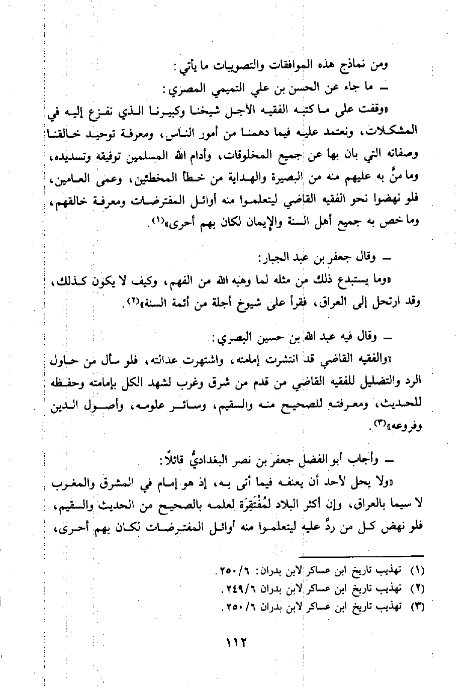 (وقفت على ما كتبه الفقيه الأجل شيخنا وكبيرنا الذي نفزع إليه في المشكلات، ونعتمد عليه فيما دهمنا من أمور الناس، ومعرفة توحيد خالقنا وصفاته التي بان بها عن جميع المخلوقات، وأدام الله للمسلمين توفيقه وتسديده، وما منَّ به عليهم منه من البصيرة والهداية من خطأ المخطئين، وعمى العامين، فلو نهضوا نحو الفقيه القاضي ليتعلموا منه أوائل المفترضات ومعرفة خالقهم، وما خص به جميع أهل السنة والإيمان لكان بهم أحرى) (¬1).