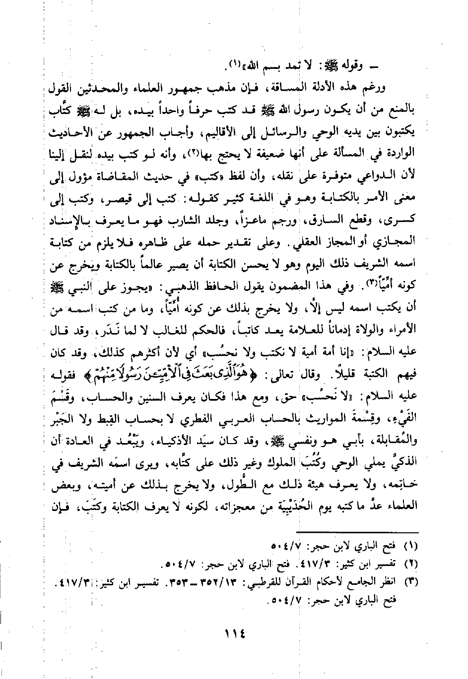 ورغم هذه الأدلة المساقة، فإن مذهب جمهور العلماء والمحدثين القول بالمنع من أن يكون رسول الله صَلَّى اللَّهُ عَلَيْهِ وَسَلَّمَ قد كتب حرفًا واحدًا بيده، بل له صَلَّى اللَّهُ عَلَيْهِ وَسَلَّمَ كتَّاب يكتبون بين يديه الوحي والرسائل إلى الأقاليم، وأجاب الجمهور عن الأحاديث الواردة في المسألة بأنها ضعيفة لا يحتج بها (¬2)، وأنه لو كتب بيده لنقل إلينا لأن الدواعي متوفرة على نقله، وأن لفظ (كتب) في حديث المقاضاة مؤول إلى معنى الأمر بالكتابة، وهو في اللغة كثير كقوله: كتب إلى قيصر، وكتب إلى كسرى، وقطع السارق، ورجم ماعزًا، وجلد الشارب، فهو ما يعرف بالإسناد المجازي أو المجاز العقلي. وعلى تقدير حمله على ظاهره فلا يلزم من كتابة اسمه الشريف ذلك اليوم وهو لا يحسن الكتابة أن يصير عالمًا بالكتابة ويخرج عن كونه أمِّيًّا (¬3). وفي هذا المضمون يقول الحافظ الذهبي: (يجوز على النبي صَلَّى اللَّهُ عَلَيْهِ وَسَلَّمَ أن يكتب اسمه ليس إلَّا، ولا يخرج بذلك عن كونه أُمِّيًّا، وما من كتب اسمه من الأمراء والولاة إدمانًا للعلامة يعد كاتبًا، فالحكم للغالب لا لما نَدَر، وقد قال عليه السلام: (إنا أمة أمية لا نكتب ولا نحسُب) أي لأن أكثرهم كذلك، وقد كان فيهم الكتبة قليلًا، وقال تعالى: {هُوَ الَّذِي بَعَثَ في الأُمِّيِّينَ رَسُولًا مِنْهُمْ} فقوله عليه السلام: (لا نَحسُب) حق، ومع هذا فكان يعرف السنين والحساب، وقَسْمَ الفَيْءِ، وقِسْمَةَ المواريث بالحساب العربي الفطري لا بحساب القِبط ولا الجَبْر والمُقابلة، بأبي هو ونفسي صَلَّى اللَّهُ عَلَيْهِ وَسَلَّمَ، وقد كان سيد الأذكياء، ويَبْعُد في العادة أن الذكيَّ يملي الوحي وكُتُبَ الملوك وغير ذلك على كتَّابه، ويرى اسمَه الشريف في خاتِمه، ولا يعرف هيئة ذلك مع الطُّول، ولا يخرج بذلك عن أُميته، وبعض العلماء عدَّ ما كتبه يوم الحُدَيْبِيَة من معجزاته، لكونه لا يعرف الكتابة وكتَبَ، فإن