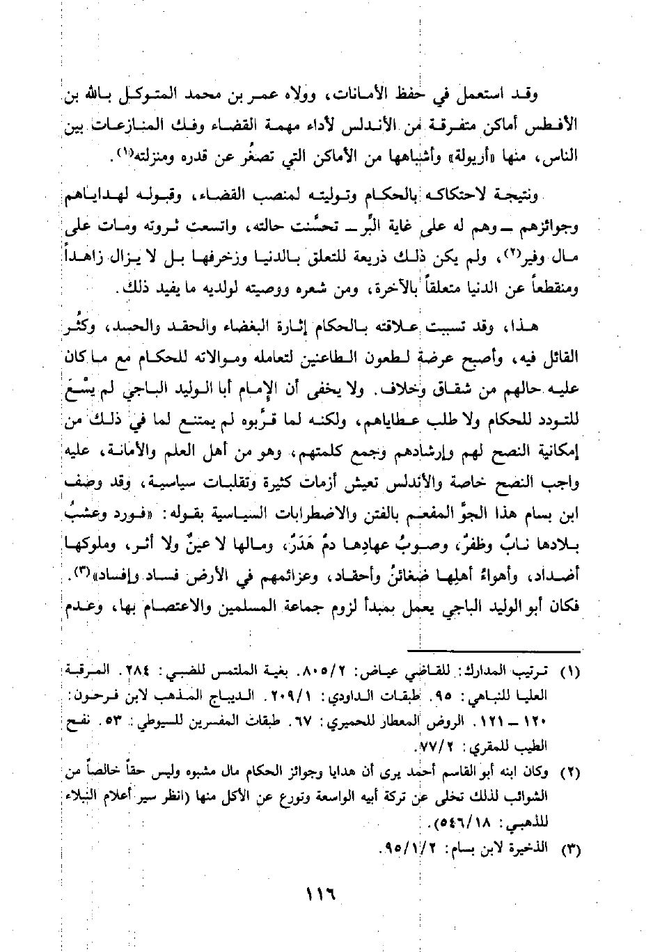 هذا، وقد تسببت علاقته بالحكام في إثارة البغضاء والحقد والحسد، وكثُر القائل فيه، وأصبح عرضة لطعون الطاعنين لتعامله وموالاته للحكام مع ما كان عليه حالهم من شقاق وخلاف. ولا يخفى أن الإمام أبا الوليد الباجي لم يسْعَ للتودد للحكام ولا طلب عطاياهم، ولكنه لما قرَّبوه لم يمتنع لما في ذلك من إمكانية النصح لهم وإرشادهم وجمع كلمتهم، وهو من أهل العلم والأمانة، عليه واجب النصح خاصة والأندلس تعيش أزمات كثيرة وتقلبات سياسية، وقد وصف ابن بسام هذا الجوَّ المفعم بالفتن والاضطرابات السياسية بقوله: (فورد وعشبُ بلادها نابٌ وظفرٌ، وصوبُ عهادِها دمٌ هَدَرٌ، ومالها لا عينٌ ولا أثر، وملوكها أضداد، وأهواءُ أهلِها ضغائنُ وأحقاد، وعزائمهم في الأرض فساد وإفساد) (¬3)، فكان أبو الوليد الباجي يعمل بمبدأ لزوم جماعة المسلمين والاعتصام بها، وعدم